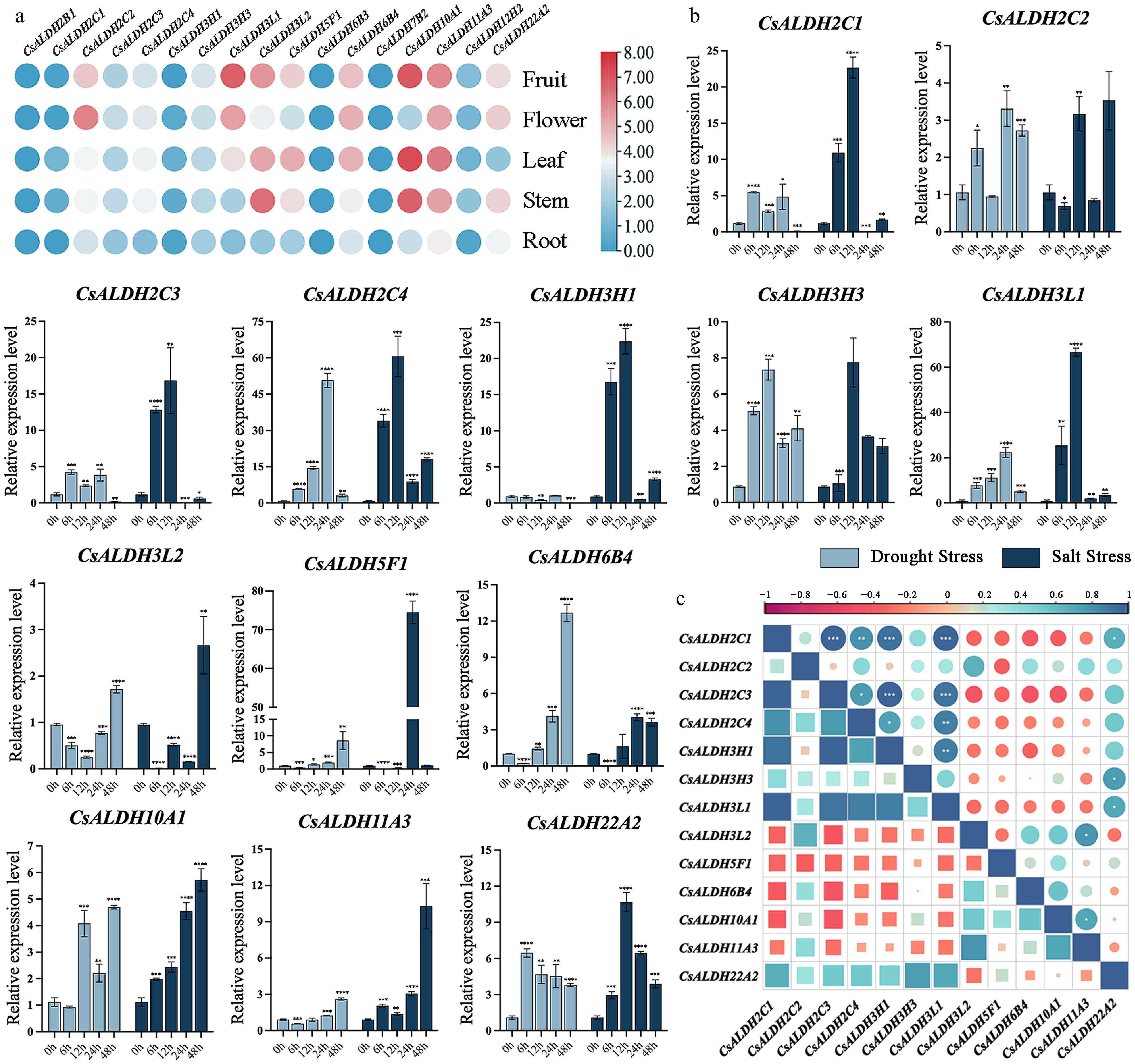 (a) The heatmap of ALDHs expression in different tissues of C. sinense. (b) Expression patterns of ALDHs in C. sinense leaves at different time points after drought and salt stress. The x-axis represents time points (0 h as the control group, 6, 12, 24, and 48 h as experimental groups). The y-axis indicates the relative expression levels after exposure to stress for different durations. Light blue bars represent drought stress, while dark blue bars represent salt stress. The symbols *, **, ***, and **** denote significant differences at p < 0.05, p < 0.01, p < 0.001, and p < 0.0001, respectively. (c) Correlation analysis of qRT-PCR results. Correlation strengths are indicated by the graduated scale above.