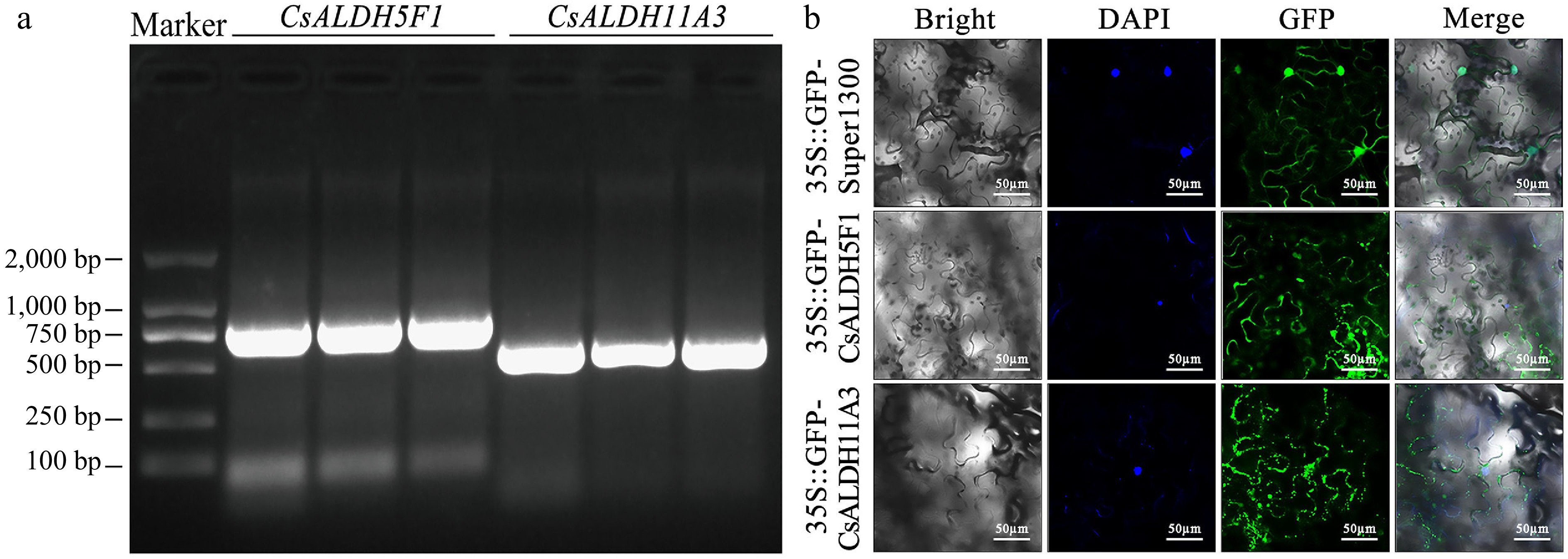 (a) Agarose gel electrophoresis of PCR-amplified DNA full-length sequences. All samples exhibited a single band at the expected size, confirming the successful amplification of the target genes. (b) Subcellular localization of CsALDH5F1 and CsALDH11A3 in N. benthamiana epidermal cells.