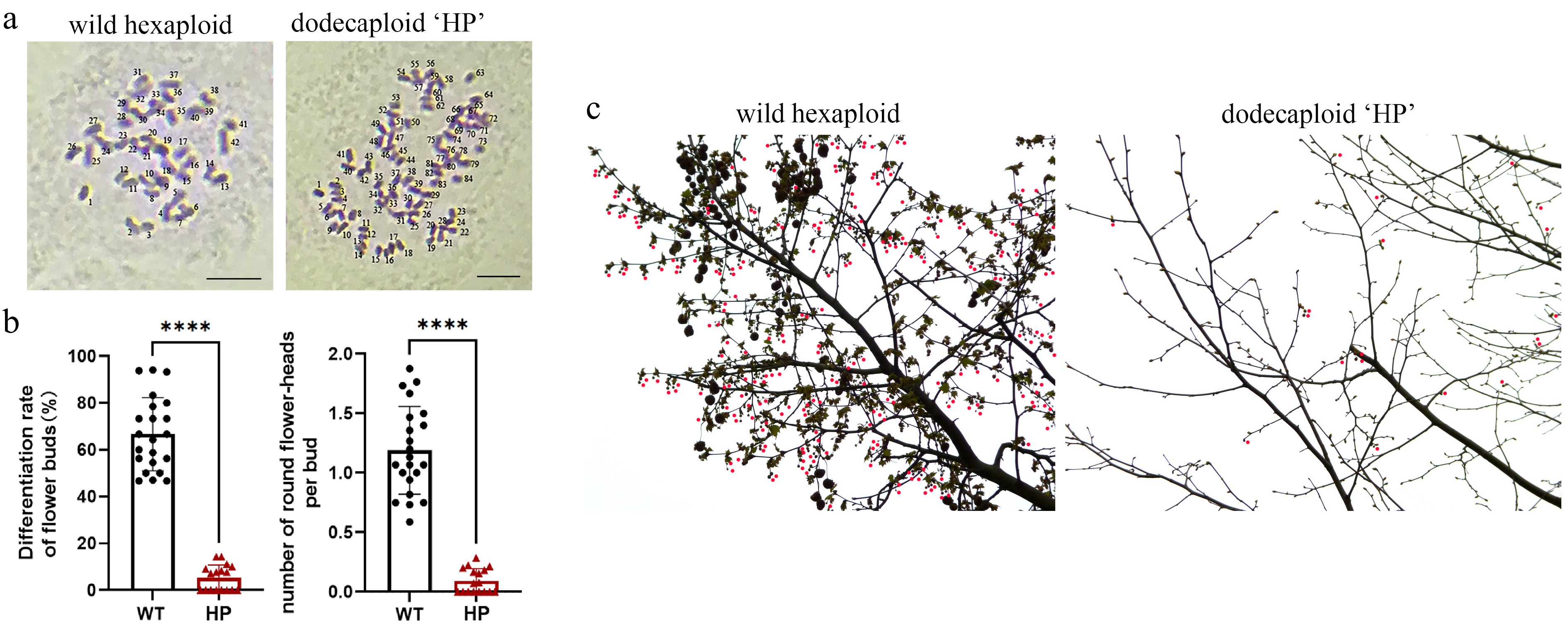 Comparative reproductive phenotyping between polyploid 'HP' and wild-type P. × acerifolia. (a) Ploidy verification. Chromosome number of bud primordia cells were observed in wild-type P. × acerifolia (left) and 'HP' line (right). Scale bars = 5 μm. (b) Quantitative assessment of reproductive efficiency. Flower bud differentiation frequency (% of total buds) and mean inflorescence count per bud were analyzed in 'WT' and 'HP' lines. Student's t-test of 20 biological replicates; Error bars indicate ± SD; **** p < 0.0001. (c) Inflorescence distribution on mid-crown branches of 'WT' and 'HP' lines. Wild-type displayed characteristic high-density floral clusters, while the 'HP' line exhibited significantly reduced flowering sites. Red dots indicate globose inflorescence.