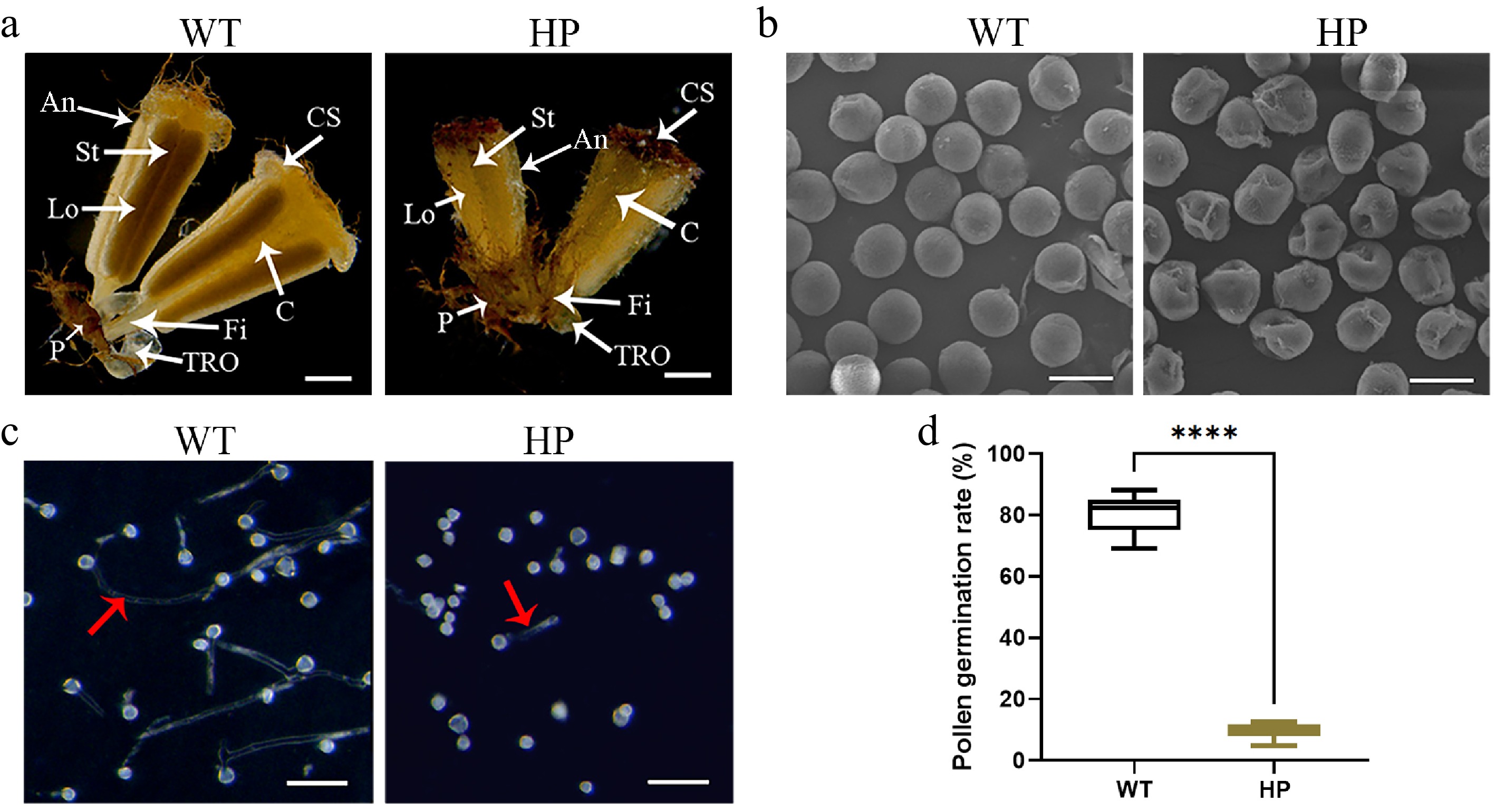 Pollen fertility analysis in wild-type ('WT') and polyploid ('HP') London plane tree. (a) Morphology of male flowers in 'WT' and 'HP'. Key floral structures: An, anther; C, connective; CS, cap structure; Fi, filament; Lo: locule; P, perianth; St, stomium; TRO, three-ridged organ. Scale bar = 1 mm. (b) Scanning electron micrographs of pollen grains. Scale bar = 20 μm. (c) In vitro pollen germination assays. Red arrow indicates pollen tubes. Scale bar = 100 μm. (d) Comparative analysis of pollen germination rate in 'WT' and 'HP' (mean ± SD; n = 4 flowers, more than a thousand pollens were analyzed).