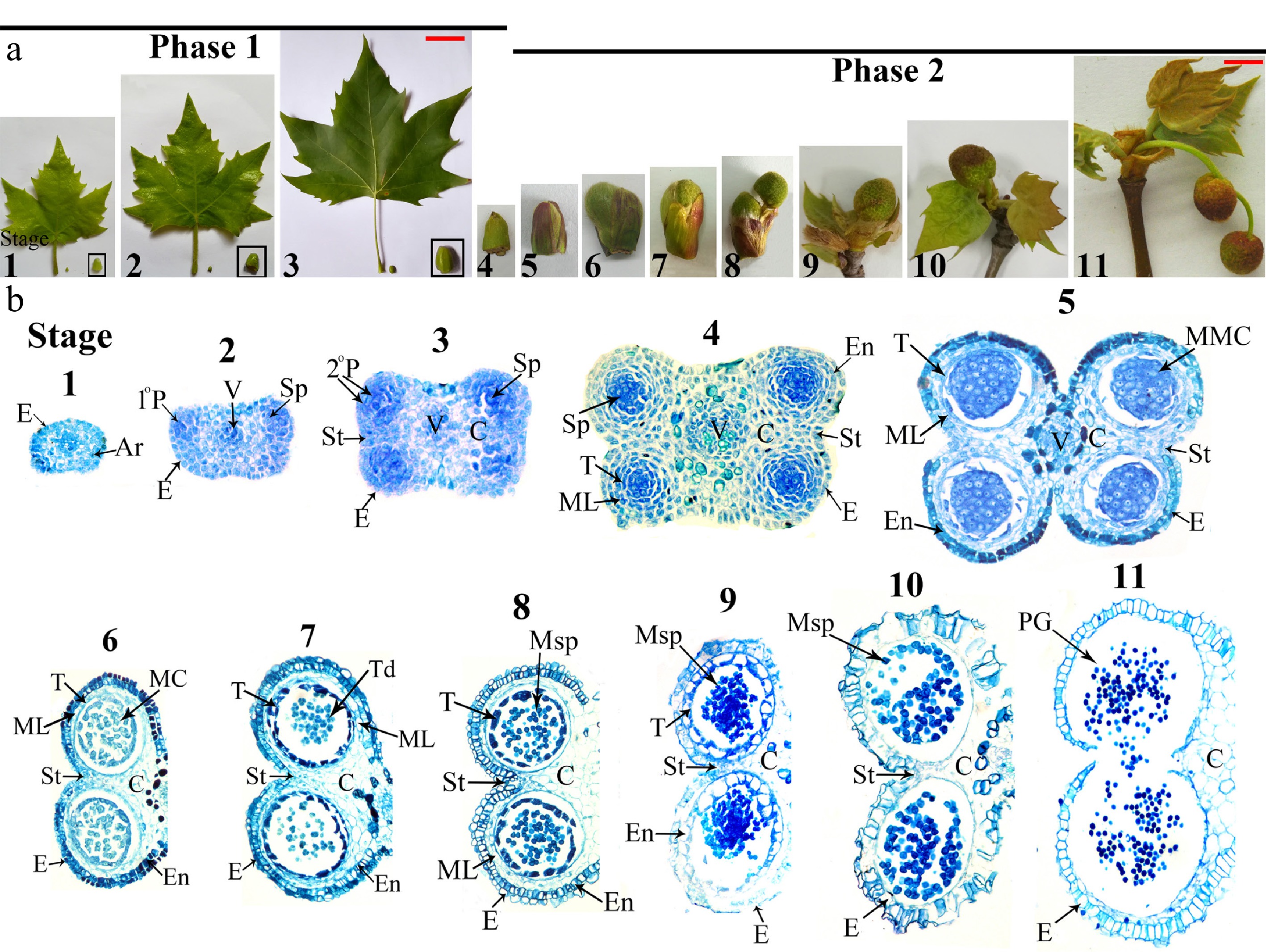 The male flower differentiation in P. × acerifolia initiates in May and progresses through April of the subsequent year. The period from May to February encompassed Phase I (Stages 1−4) of anther development, corresponding to the vegetative growth phase that culminates in dormancy. During this phase, all major anther tissues became fully differentiated. Specifically, Phase I comprises the early differentiation of various tissues, including the epidermis, endothecium, vascular bundle, connective, stomium and tapetum (Stages 1–4, Fig. 3b). The transitional period from late February through April marks dormancy release and leaf bud break (Fig. 3a), coinciding with Phase II of anther development (Stages 5−11). During this critical phase, two key developmental processes were completed, as microsporogenesis and gametogenesis, as well as anther maturation and dehiscence (Stages 5–11, Fig. 3b).