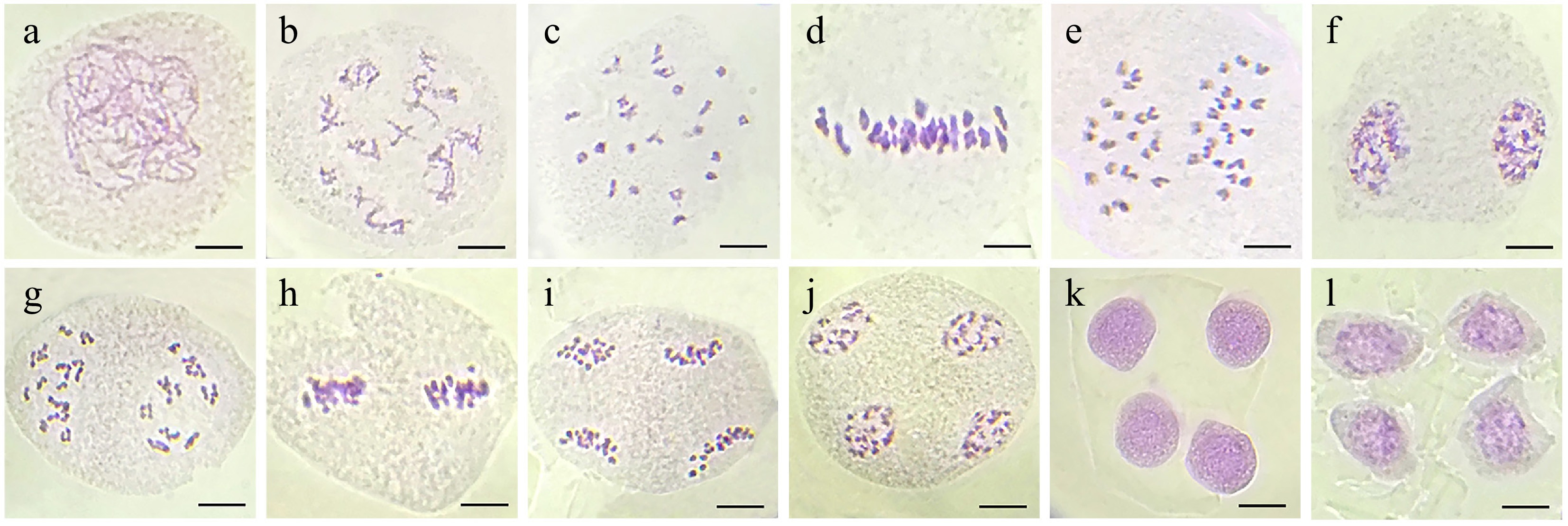 In wild P. × acerifolia, microsporogenesis involves one meiotic division followed by a mitotic division in pollen mother cells, ultimately producing four male gametes. The earliest observed stage (Fig. 4a) was leptotene, showing faint linear chromosome axes. During pachytene, homologous chromosomes synapsed and underwent recombination (Fig. 4b), later condensing into V-, O-, X-, and 8-shaped bivalents at diakinesis (Fig. 4c). At metaphase I, bivalents aligned equatorially (Fig. 4d), followed by anaphase I segregation via spindle traction (Fig. 4e). Telophase I yielded dyads with haploid chromosome sets (Fig. 4f). Meiosis II began with rod-like chromosomes in prophase II (Fig. 4g), equatorial alignment at metaphase II (Fig. 4h), and sister chromatid separation in anaphase II (Fig. 4i). Telophase II produced a tetrad (Fig. 4j, k), eventually forming four uninucleate microspores (Fig. 4l).