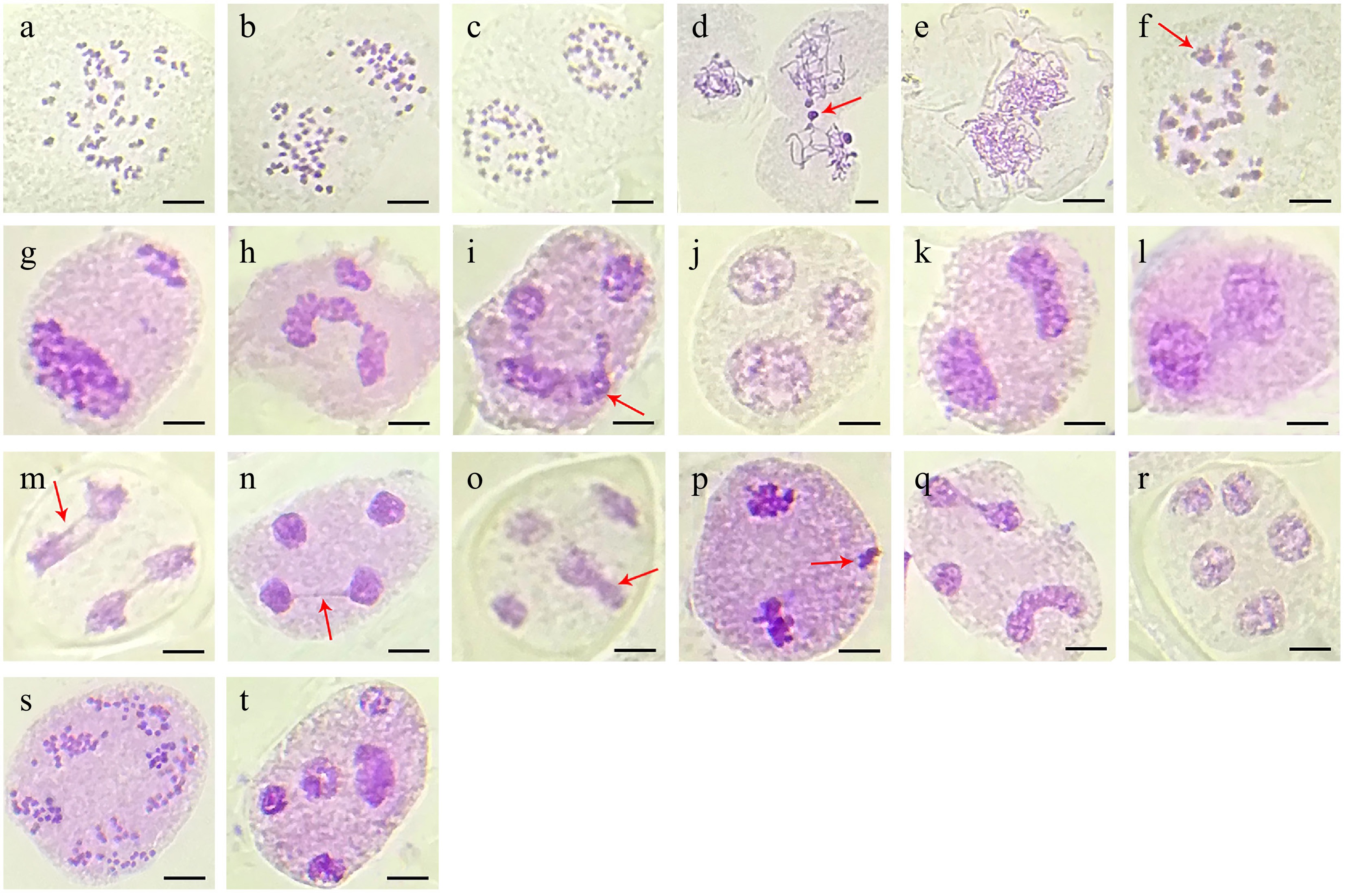 Meiotic behavior observed in the polyploid 'HP' line of London plane tree. (a) Diakinesis with 42 bivalents. (b) Anaphase I with 42:42 chromosomes. (c) Telophase I with two daughter cells. (d) Early prophase with chromatin transfer (arrow). (e) Proximate pollen mother cell with double chromosome complement. (f) Anaphase I with interbivalent stickiness (arrow). (g), (h) Unbalanced chromosome segregation leading to additional nuclear clusters in telophase I. (i), (j) Anaphase II with severe chromosome stickiness in one daughter cell (arrow) impairing chromosome segregation leading to triad formation. (k), (l) Both daughter cells showing chromosome stickiness and forming dyads. (m), (n) Anaphase II and telophase II with chromosome stickiness in micronuclei through chromosome bridges (arrow). (o) Telophase II with irregular microspore (arrow). (p) Telophase I with one extra nuclear chromosome cluster (arrow). (q), (r) One extra nucleus and abnormal chromosome segregation formed into polyad. (s), (t) Chromosome segregation with abnormal spindle orientation leading to polyad formation with unequal microspores.