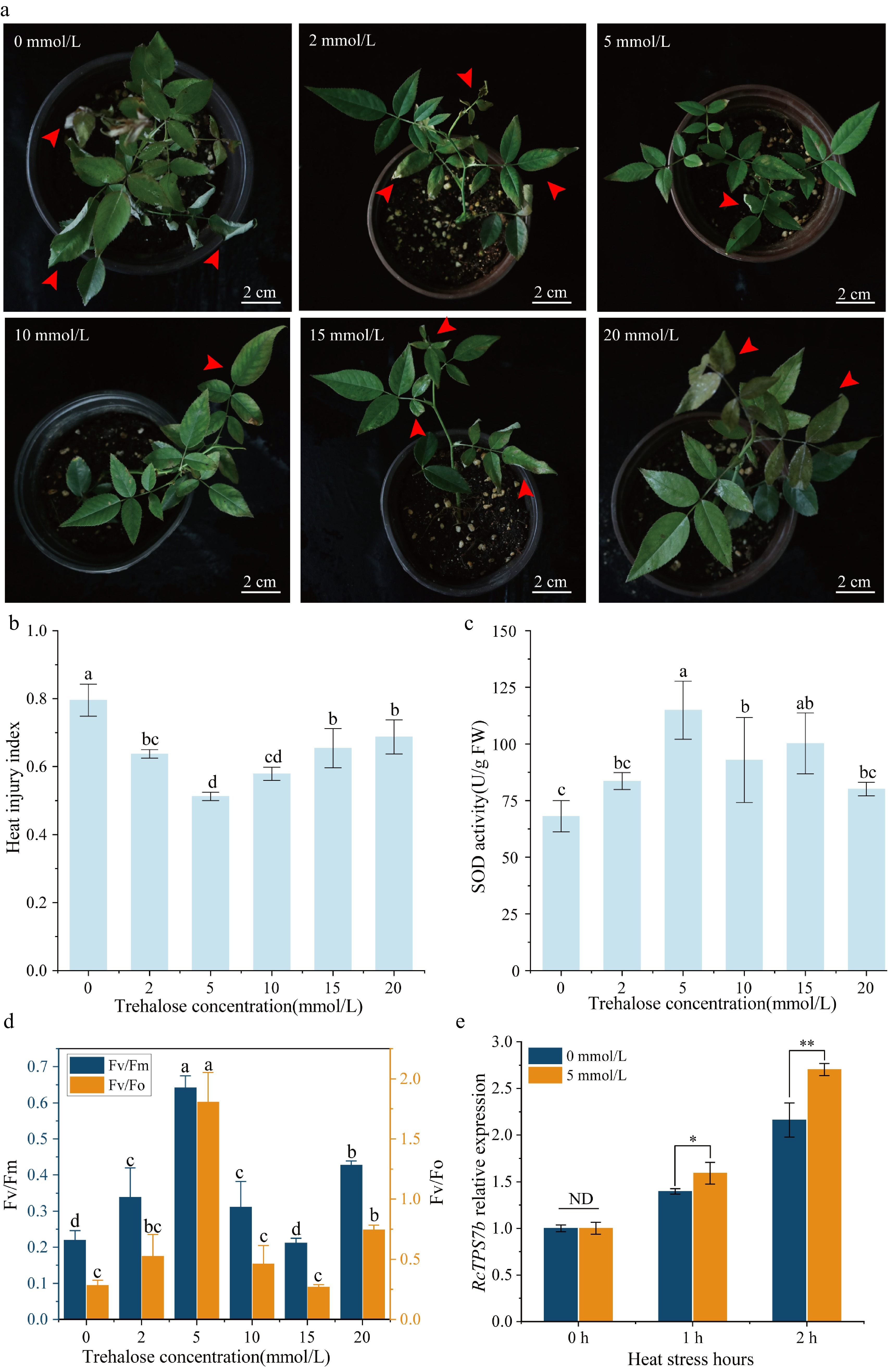 Exogenous trehalose treatment improved the heat tolerance of R. chinensis 'Slater's Crimson China'. (a) Phenotypic analysis of R. chinensis 'Slater's Crimson China' treated with 0–20 mmol/L trehalose under 45 °C for 36 h. (b) Heat injury index analysis. (c) SOD activity analysis. (d) Parameter analysis of the photosynthetic system. (e) Transcription analysis of RcTPS7b in R. chinensis plants treated with 0 or 5 mmol/L trehalose under heat stress. Data are presented as the mean ± SD of three biological replicates. In (b)–(d), letters denote significant differences (ANOVA; a > b > c >d; p < 0.05). In (e), * p < 0.05 and ** p < 0.01 (Student's t-test; ND, no difference).