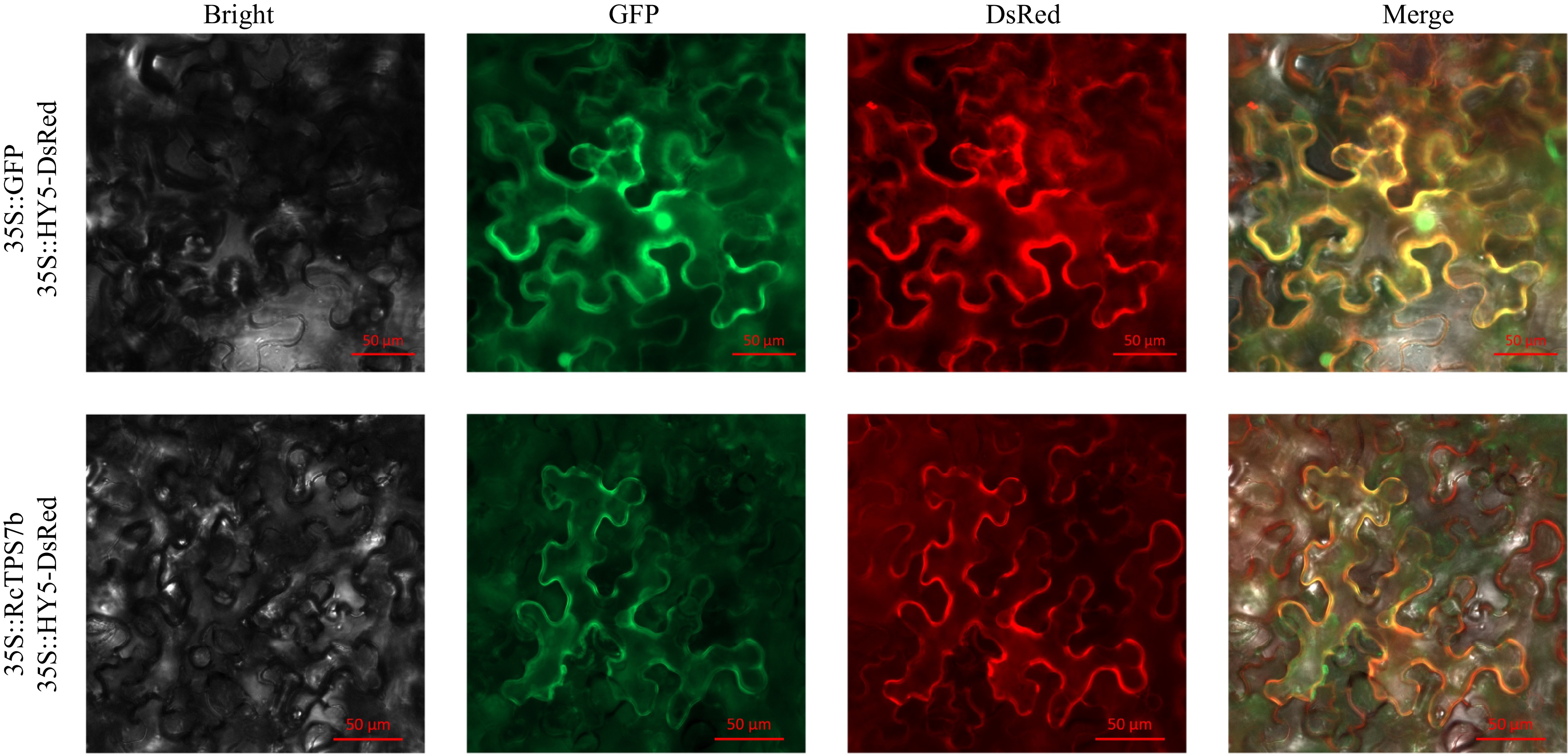 Subcellular localization of RcTPS7b in tobacco leaves. Bright, brightfield; GFP, GFP fluorescence; DsRed, cell membrane marker fluorescence; Merge, superimposed field.