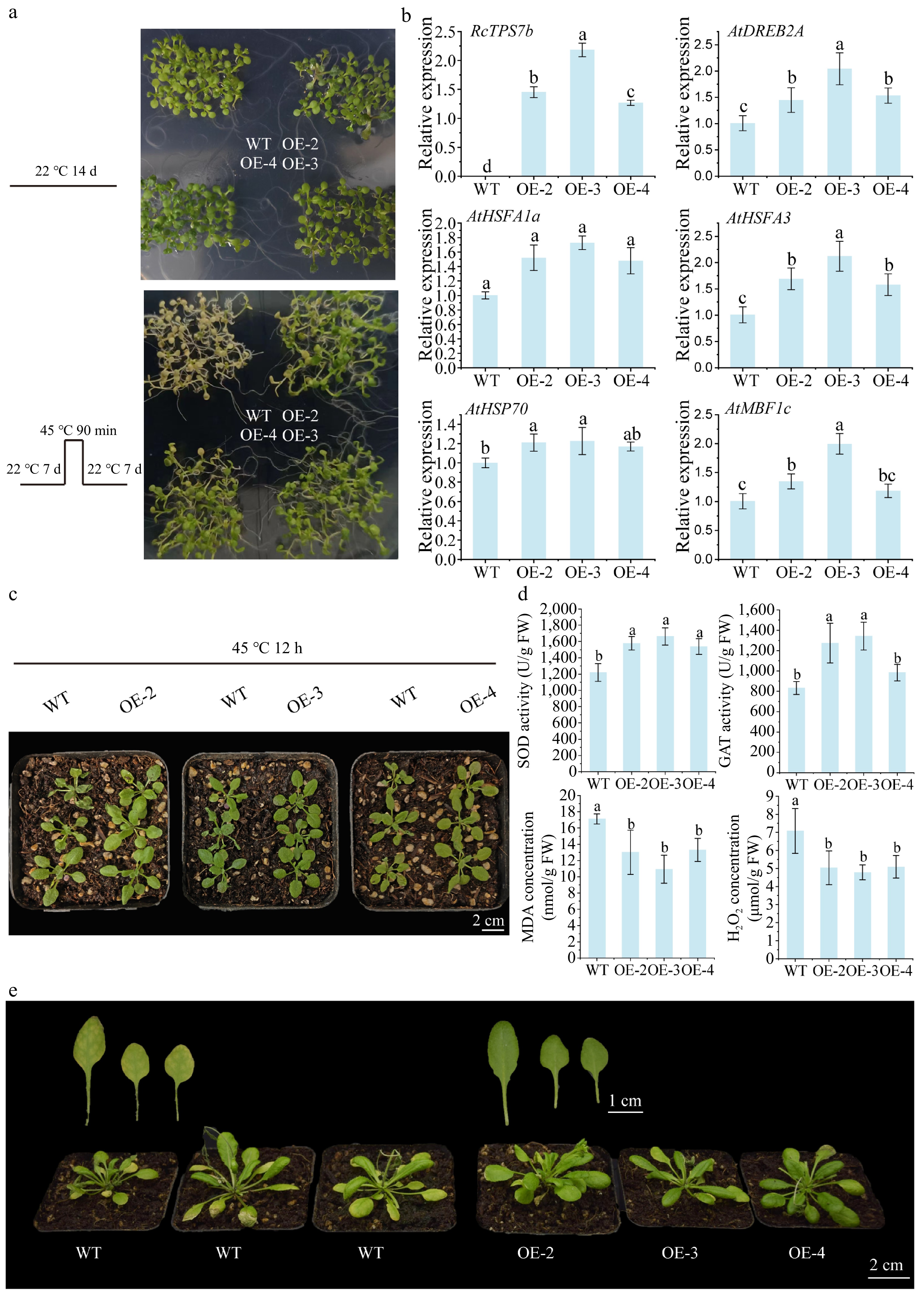 Overexpression of RcTPS7b improved the heat tolerance of A. thaliana. (a) The phenotypic changes in 7-day-old WT and overexpression (OE) lines were observed at 22 °C for 14 days, at 22 °C for 7 d then at 45 °C for 90 min, and then at 22 °C for 7 d. (b) Transcriptional expression of RcTPS7b and heat stress response genes in 7-day-old WT and OE lines after 90 min of heat stress at 45 °C followed by 7 d of recovery growth at 22 °C (ANOVA; a > b > c > d; p < 0.05). (c) Phenotypic changes in 20-day-old WT and OE lines under heat stress at 45 °C for 12 h. (d) Determination of the content of physiologically active substances in 20-day-old WT and OE lines under 45 °C heat stress for 12 h (ANOVA; a > b; p < 0.05). (e) Phenotypic changes in 30-day-old WT and OE lines under heat stress at 45 °C for 36 h. Data are presented as the mean ± SD of three biological replicates.