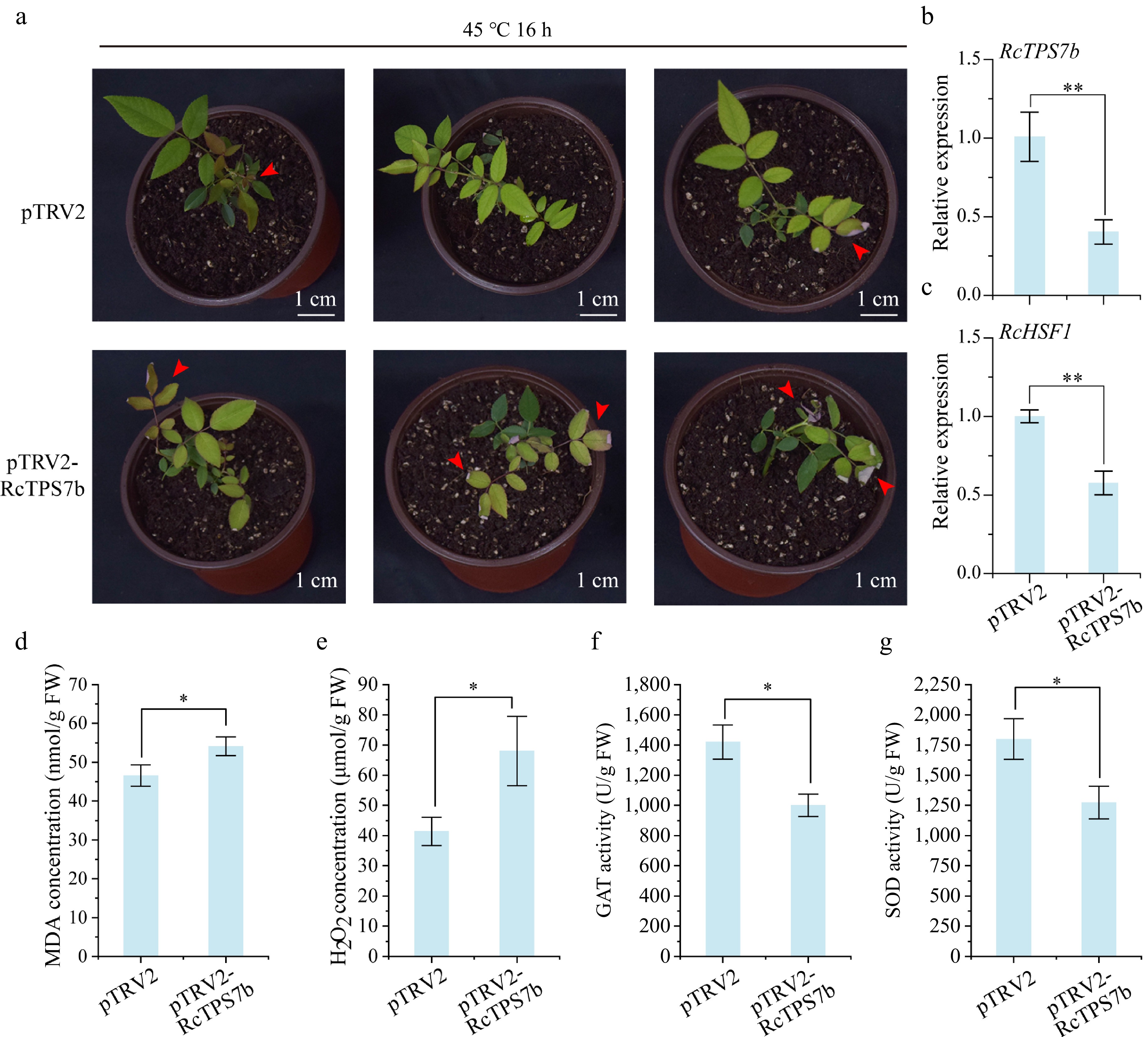 • In order to verify the function of RcTPS7b in regulating heat tolerance in R. chinensis, RcTPS7b was chosen for VIGS using a pTRV-based system. Compared with the pTRV2 control plants, RcTPS7b-silenced plants exhibited leaf curl and necrosis phenotypes after heat stress at 45 °C for 16 h (Fig. 5a). The expression of RcTPS7b in virus-induced RcTPS7b-silenced plants was significantly lower than that in pTRV2 control plants (transformed with the pTRV2 vector) (Fig. 5b). RT-qPCR analysis showed that the expression level of the heat stress-responsive transcription factor gene RcHSF1 was significantly reduced in RcTPS7b-silenced plants compared with the pTRV2 controls (p < 0.01; Fig. 5c). Physiological analysis showed that compared with the pTRV2 control plants, the content of H2O2 in RcTPS7b-silenced plants increased by 64.2%, and the content of MDA increased by 16.2% (p < 0.05; Fig. 5d, e). Meanwhile, SOD activity decreased by 29.2%, and CAT activity decreased by 29.4% (p < 0.01; Fig. 5f, g). These data demonstrate that RcTPS7b silencing impairs heat tolerance by downregulating RcHSF1, compromising ROS scavenging capacity and enhancing membrane peroxidation.