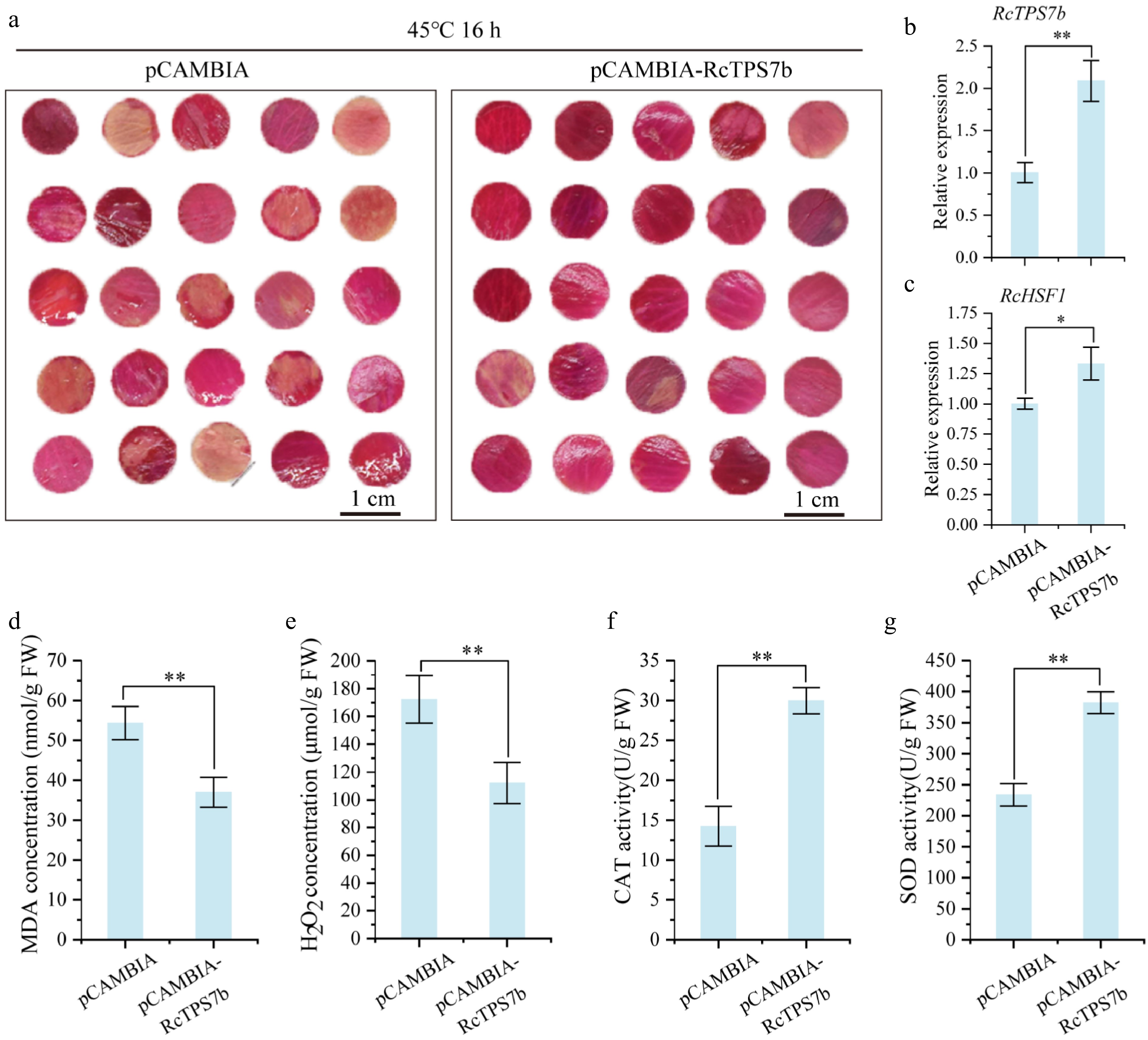 Transient overexpression of RcTPS7b increased the heat tolerance of rose petals. (a) Phenotypic changes in RcTPS7b-overexpressing and control petals after 45 °C heat stress for 16 h. (b), (c) RcTPS7b/RcHSF1 transcript levels after overexpression. (d)–(g) The content of physiologically active substances in RcTPS7b-overexpressing and control petals after 45 °C heat stress for 16 h. Data are presented as the mean ± SD of three biological replicates. Statistical significance: * p < 0.05 and ** p < 0.01 (Student's t-test).