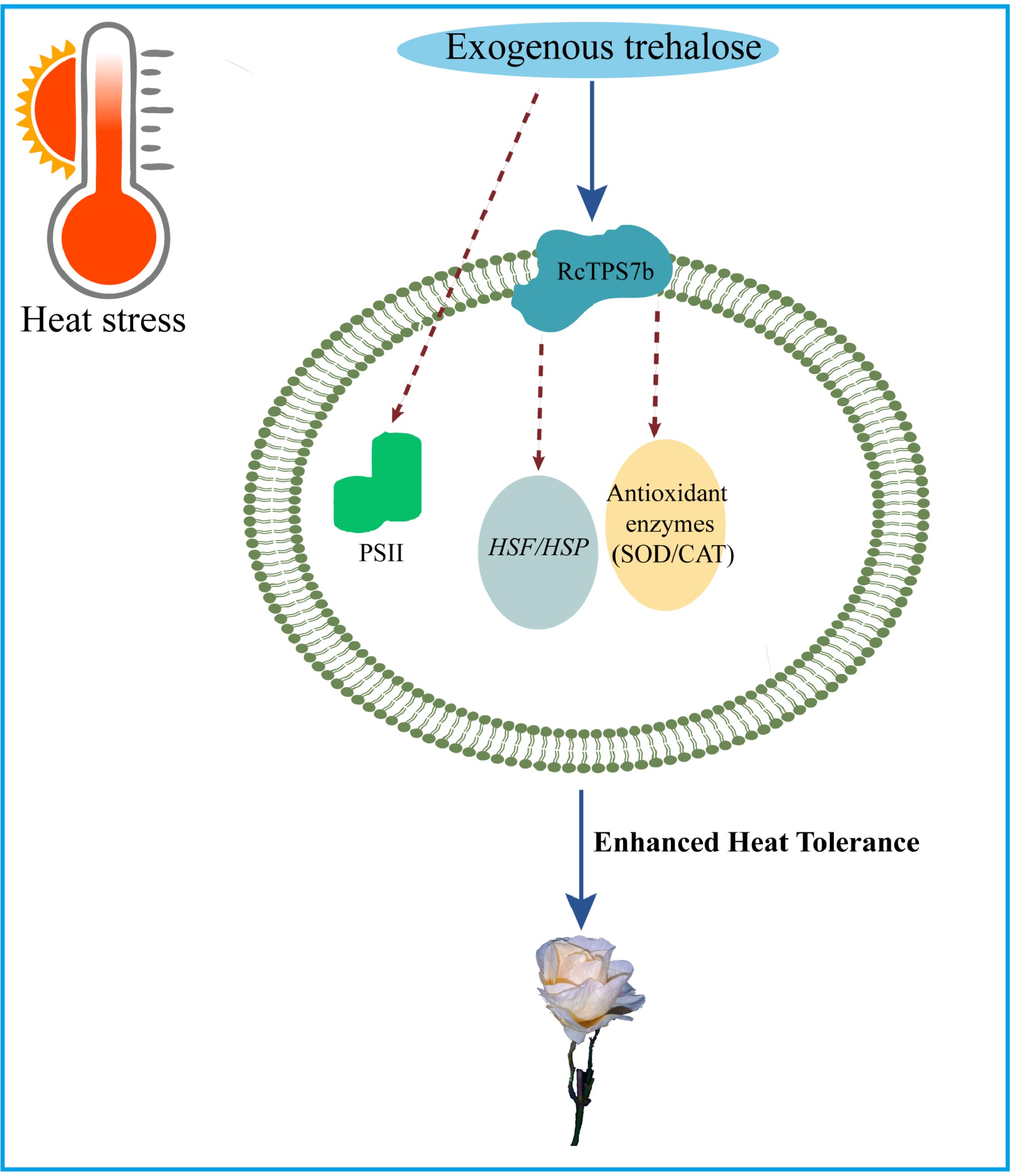 • This study elucidated the synergistic mechanism of exogenous trehalose and endogenous RcTPS7b in regulating heat tolerance in R. chinensis. We demonstrated that exogenous trehalose enhanced transcriptional levels of RcTPS7b to amplify heat stress responses, while RcTPS7b coordinated dual pathways (activating heat shock signaling and maintaining redox homeostasis) to improve thermal resilience. The work elucidates the dynamic interactions between metabolites and genetic networks, advancing our understanding of plants' environmental adaptation. These findings provide a theoretical basis for the molecular mechanism of heat tolerance in rose.