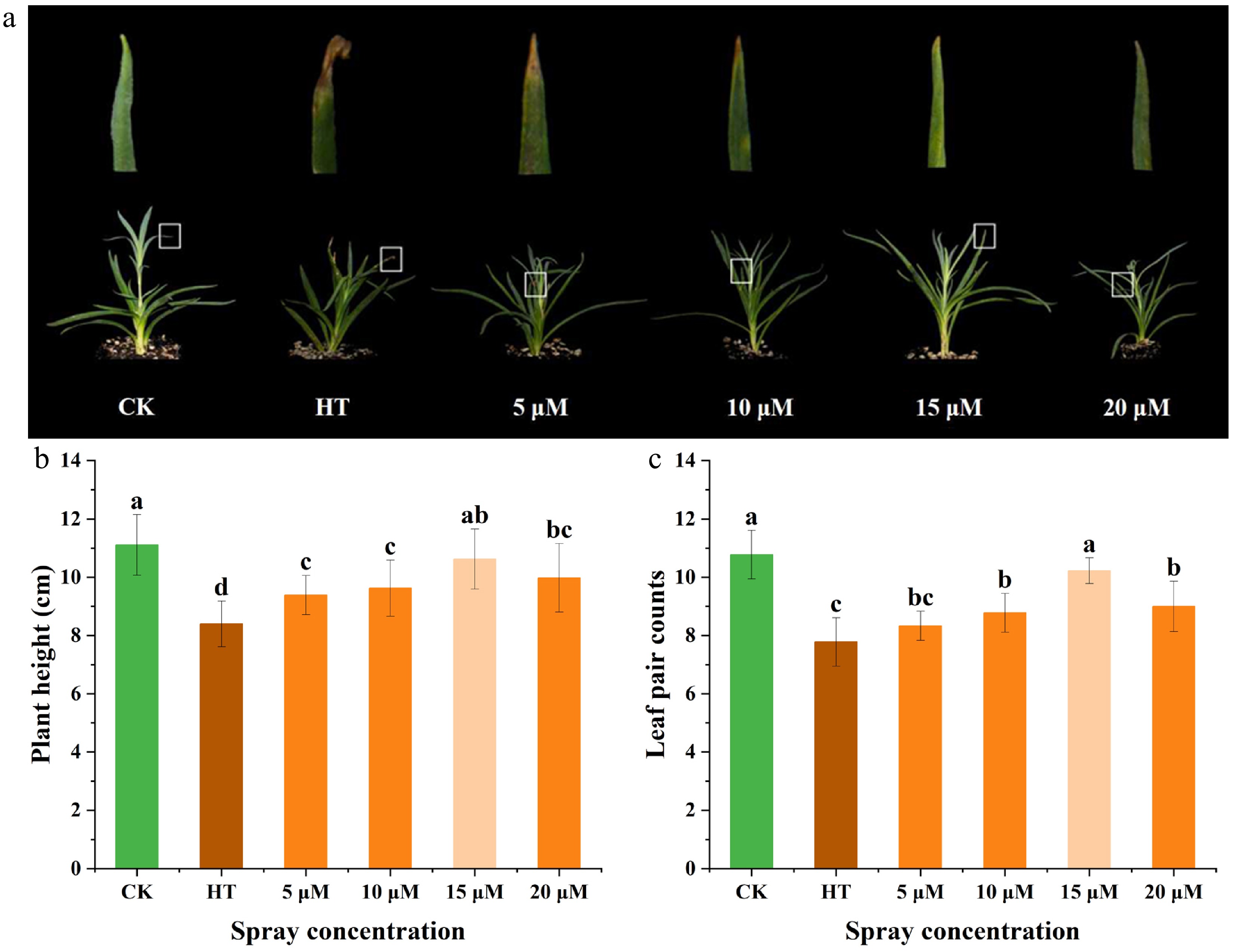 • To assess the impact of GR24 pre-treatment on carnation phenotypes subjected to heat stress, seedlings were pre-sprayed with varying concentrations of GR24. Observations revealed that CK plants exhibited dark green foliage and a more extensive canopy spread, whereas HT plants displayed symptoms including leaf tip necrosis, yellowing, and wilting. Pre-treatment with different concentrations of GR24 conferred varying degrees of mitigation against heat damage. Notably, the 15 μM GR24 treatment conferred the most effective protection, preserving large, well-expanded canopies with minimal leaf injury (Fig. 1a). Analysis of plant height revealed that HT significantly inhibited seedling height by 24.4% compared to CK, while exogenous GR24 pre-application alleviated this inhibitory effect. Specifically, plant heights in the 5, 10, 15, and 20 μM GR24 treatment groups increased by 11.77%, 14.55%, 26.45%, and 18.78%, respectively, relative to the HT group (Fig. 1b). Additionally, the number of leaf pairs decreased by 27.83% under HT compared to CK. Pre-treatment with GR24 at concentrations of 5, 10, 15, and 20 μM resulted in increases of 7.14%, 12.86%, 31.43%, and 15.71%, respectively, in leaf pair counts relative to the HT group (Fig. 1c). Collectively, these findings indicated that heat stress inhibited carnation seedling growth and caused thermal injury, whereas pre-application of GR24 mitigated these effects in a dose-dependent manner.