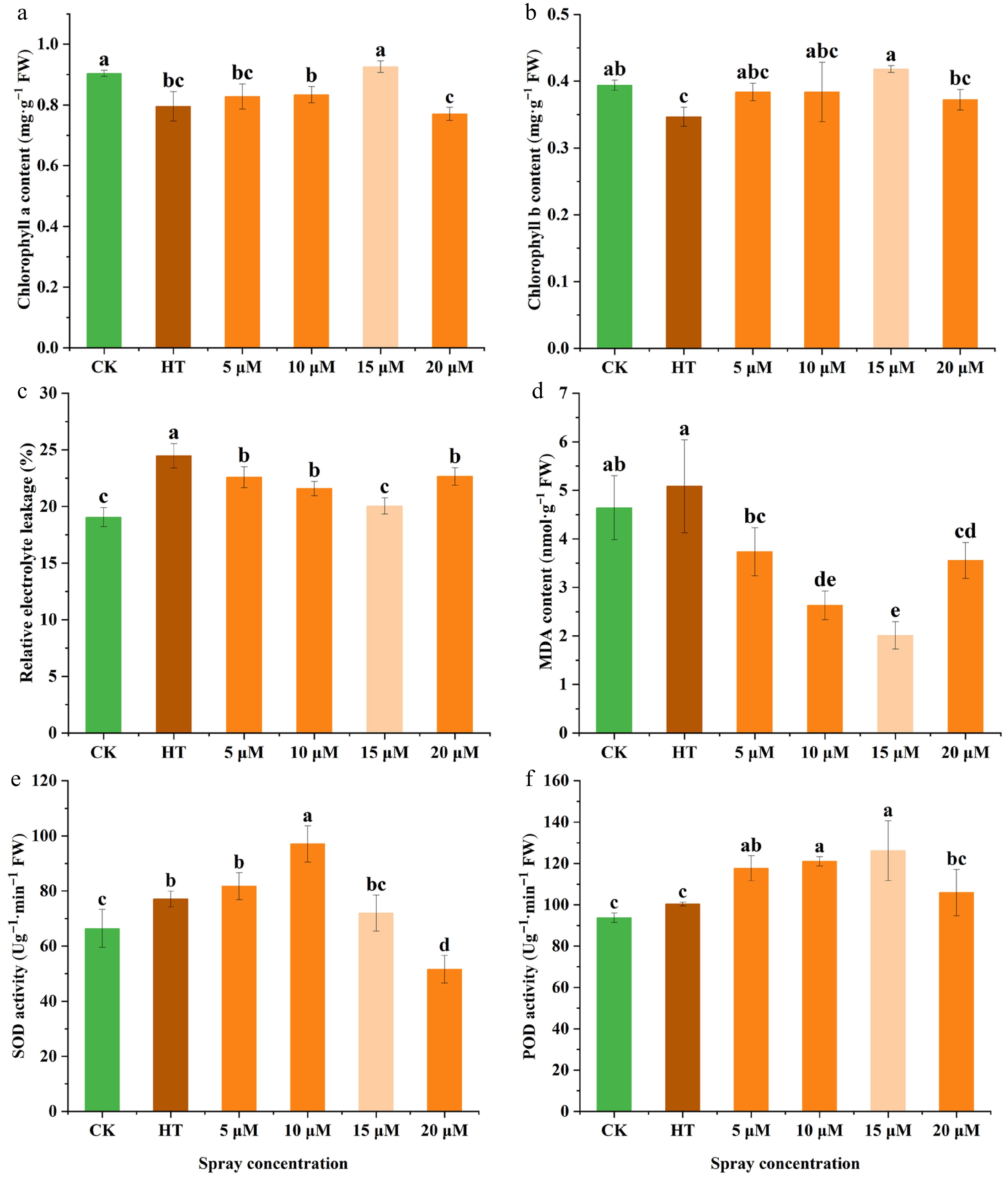 Effects of pre-spraying with different concentrations of GR24 on the physiological properties of carnation seedlings under HS. (a) Chlorophyll a content. (b) Chlorophyll b content. (c) Relative electrolyte leakage. (d) MDA content. (e) SOD activity. (f) POD activity. Data shown as mean ± SD, and different letters indicate significant differences (p < 0.05).
