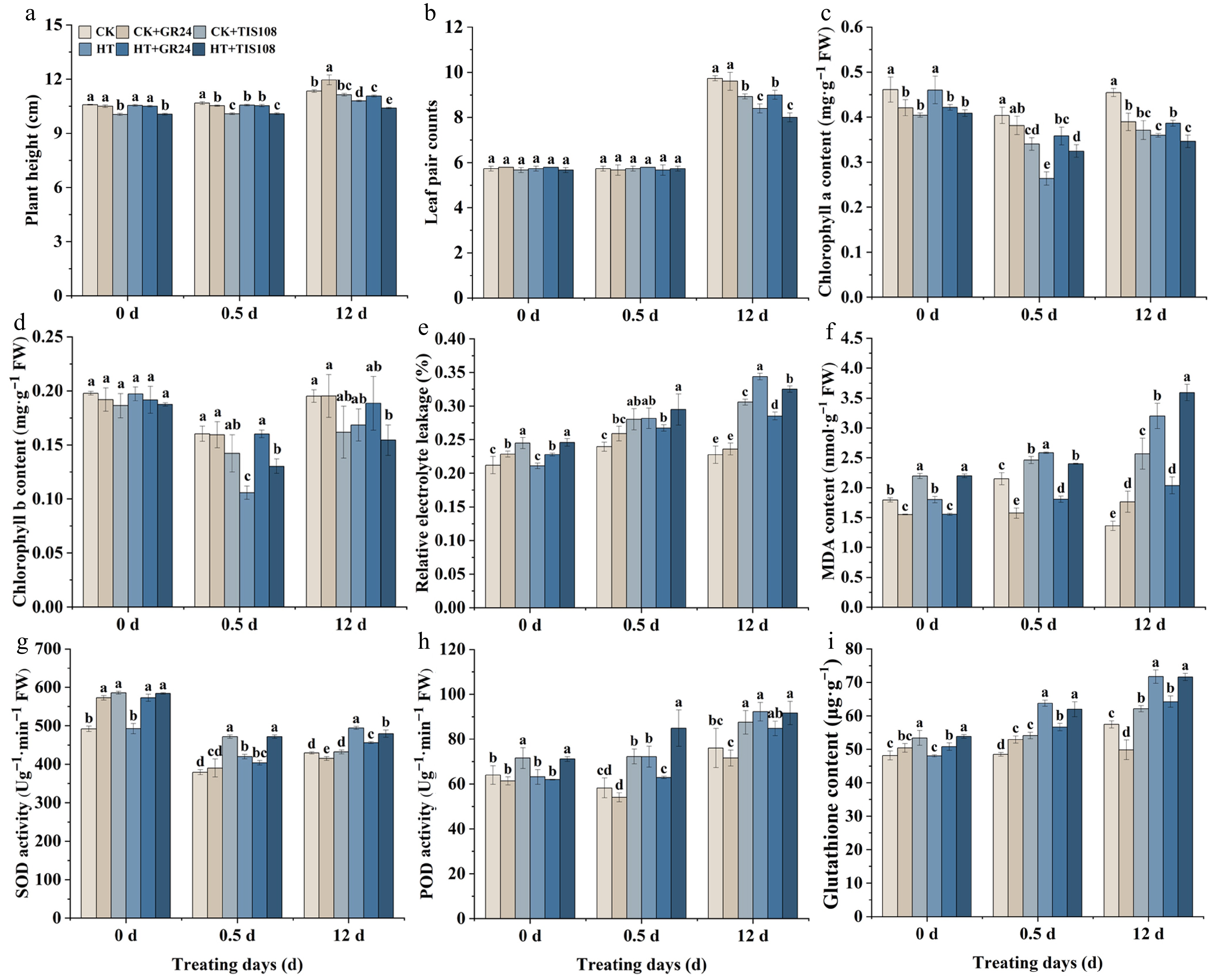 Effects of pre-spraying with GR24 and TIS108 on the growth and physiological properties of carnation seedlings under HS. (a) Plant height. (b) Leaf pair counts. (c) Chlorophyll a content. (d) Chlorophyll b content. (e) Relative electrolyte leakage. (f) MDA content. (g) SOD activity. (h) POD activity. (i) Glutathione content. Plants were subjected to foliar sprays once daily for 3 d prior to the heat stress (HT) treatment and subsequently every three days during the 12 d HT period, with sampling conducted at 0 (pre-HT), 0.5, and 12 d of HT. Data shown as mean ± SD, and different letters indicate significant differences (p < 0.05).