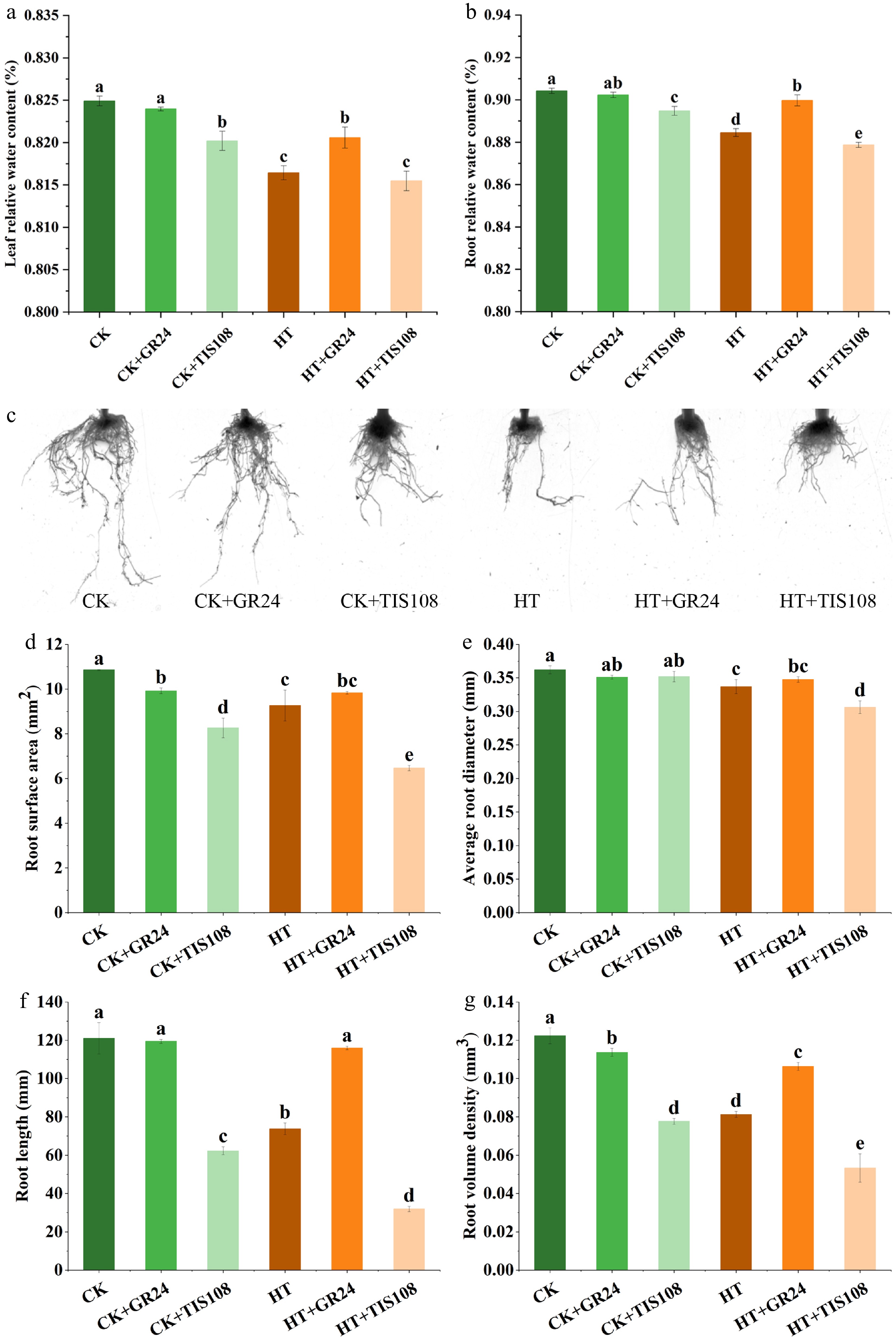 Effects of pre-spraying with GR24 and TIS108 on relative water content and root systems of carnation seedlings under HS. (a) Leaf relative water content. (b) Root relative water content. (c) Root phenotype. (d) Root surface area. (e) Average root diameter. (f) Root length. (g) Root volume density. Data shown as mean ± SD, and different letters indicate significant differences (p < 0.05).