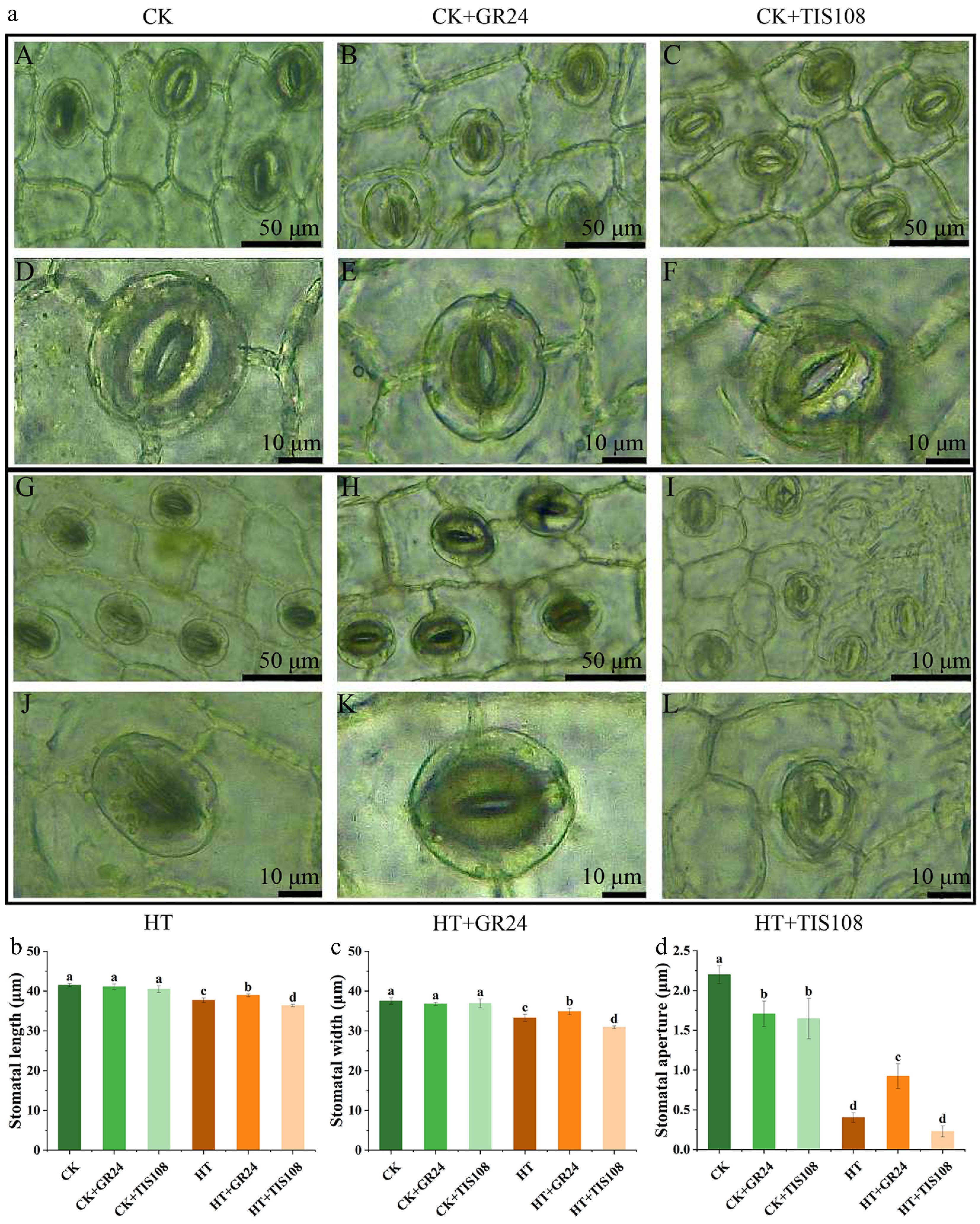 Effects of pre-spraying with GR24 and TIS108 on stomatal characteristics of carnation seedlings under HS. (a) A, D: CK; B, E: CK+GR24; C, F: CK+TIS108; G, J: HT; H, K: HT+GR24; I, L: HT+TIS108. (b) Stomatal length. (c) Stomatal width. (d) Stomatal aperture. Data shown as mean ± SD, and different letters indicate significant differences (p < 0.05).