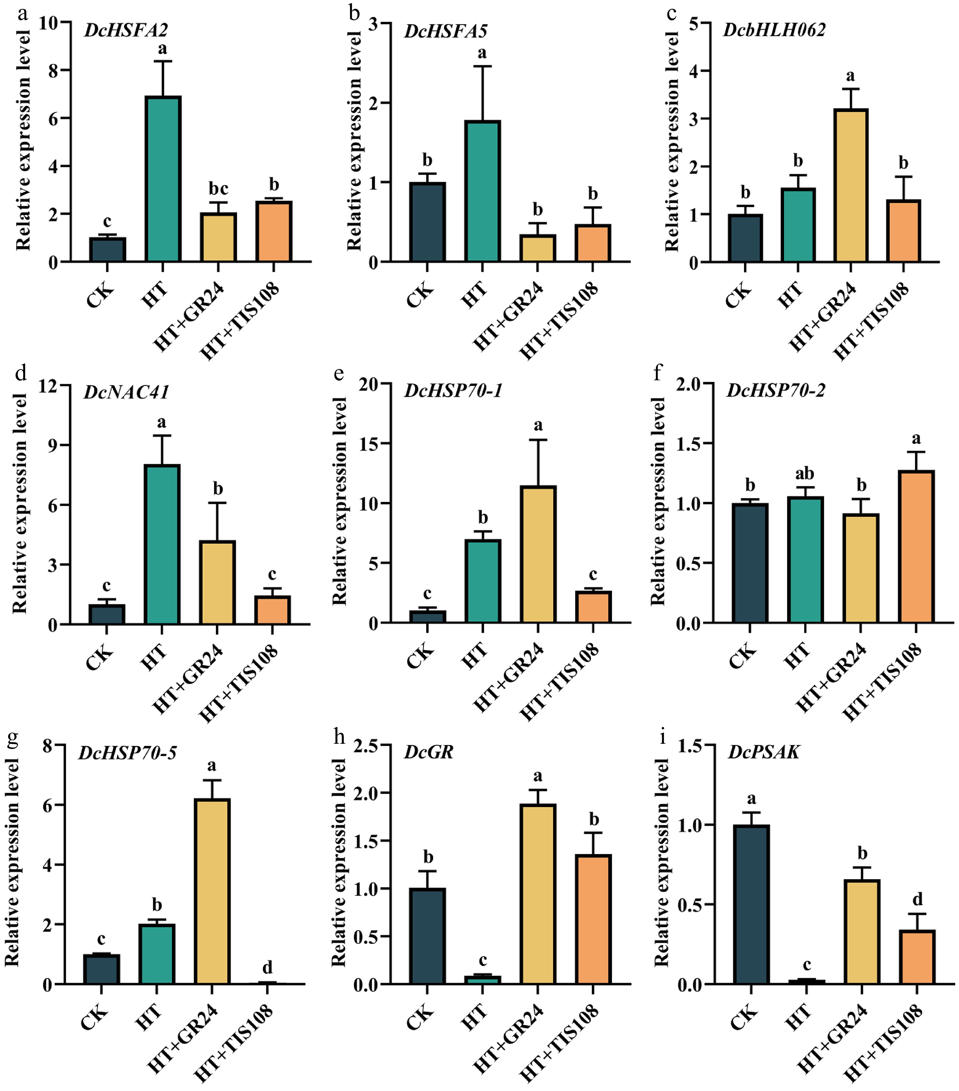 Effects of pre-spraying with GR24 and TIS108 on gene expression of carnation seedlings under HS. (a) DcHSFA2. (b) DcHSFA5. (c) DcbHLH062. (d) DcNAC41. (e) DcHSP70-1. (f) DcHSP70-2. (g) DcHSP70-5. (h) DcGR. (i) DcPSAK. Data shown as mean ± SD, and different letters indicate significant differences (p < 0.05).