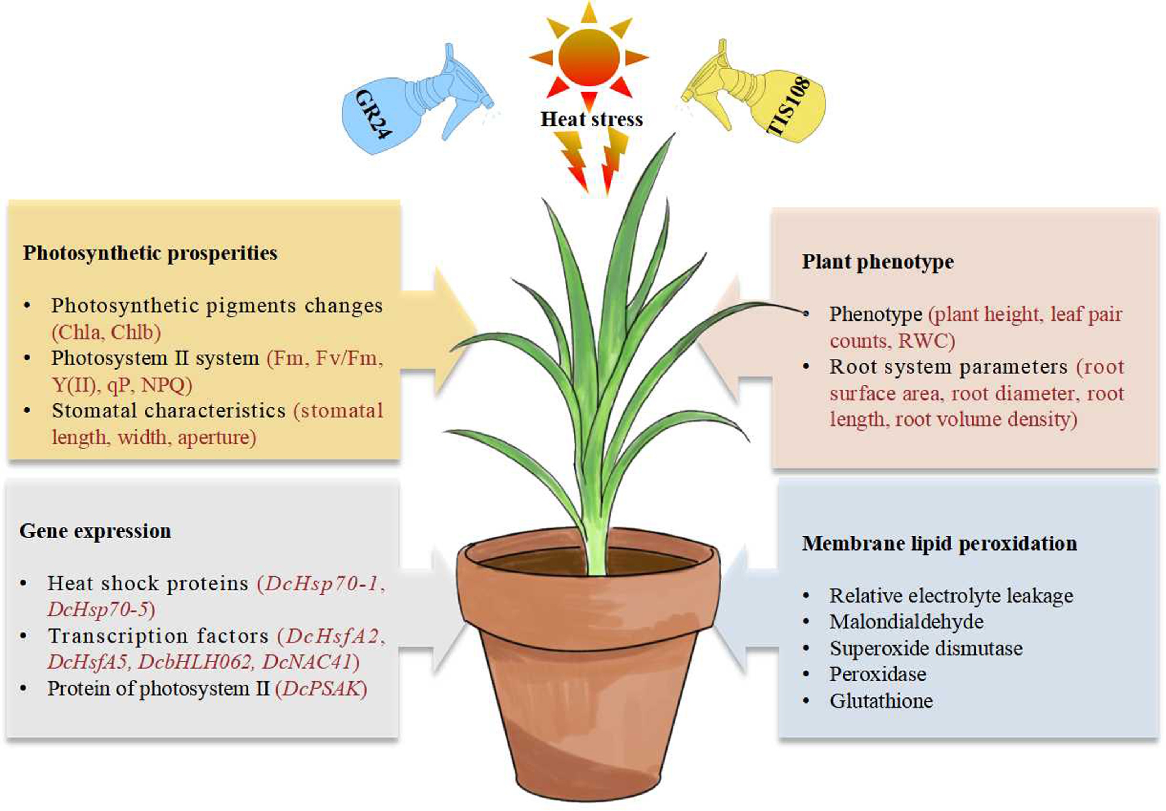 • This research clarified the function of SLs in the heat stress response of carnation. A thorough assessment combining phenotypic and physiological measurements identified 15 μM GR24, a synthetic SL analog, as the optimal concentration to alleviate heat-induced damage in carnation seedlings. Pre-treatment with GR24 effectively preserved cell membrane integrity, enhanced leaf chlorophyll content, and restored the photochemical efficiency of PS II under heat stress. Additionally, GR24 reduced heat-induced growth inhibition, optimized root system architecture, and improved leaf stomatal traits. Concurrently, GR24 significantly modulated the expression levels of key heat-responsive genes, collectively helping to reduce heat damage. Antagonistic experiments using TIS108 further confirmed that SLs play a crucial role in enhancing thermotolerance in carnation seedlings (Fig. 7). These findings provide a scientific foundation for applying SL regulation strategies to improve thermotolerance and enable cost-effective cultivation of carnations.