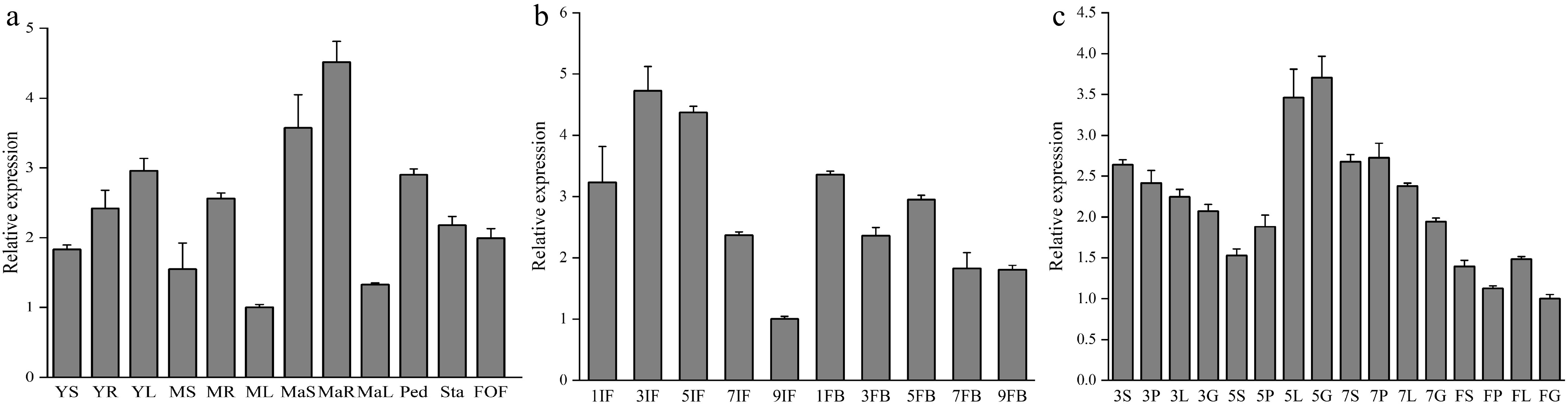 Expression of DhCOR413PM1 in different tissues and floral organs during development. (a) Expression of DhCOR413PM1 in different tissues at various development stages. YS,YR, and YL are stem, root, and leaf of young seedlings (juvenile stage), respectively; MS, MR, and ML are stem, root, and leaf of middle-age seedling (vegetative stage), respectively; MaS, MaR, and MaL are stem, root, and leaf of mature plant (reproductive stage), respectively; Ped, peduncle; Sta, stalk; FOF, fully open flower. (b) Expression of DhCOR413PM1 in inflorescences and flower buds at different development stages. IF, inflorescence meristem (1–9 cm in length); FB, flower bud (1–9 mm in diameter). (c) Expression of DhCOR413PM1 in floral organs at different development stages (3–7 mm diameter flower bud and fully open flower). S, Sepals; P, Petals; L, Labellum; G, gynandrium. Error bars represent ± SE of the three biological replicates.