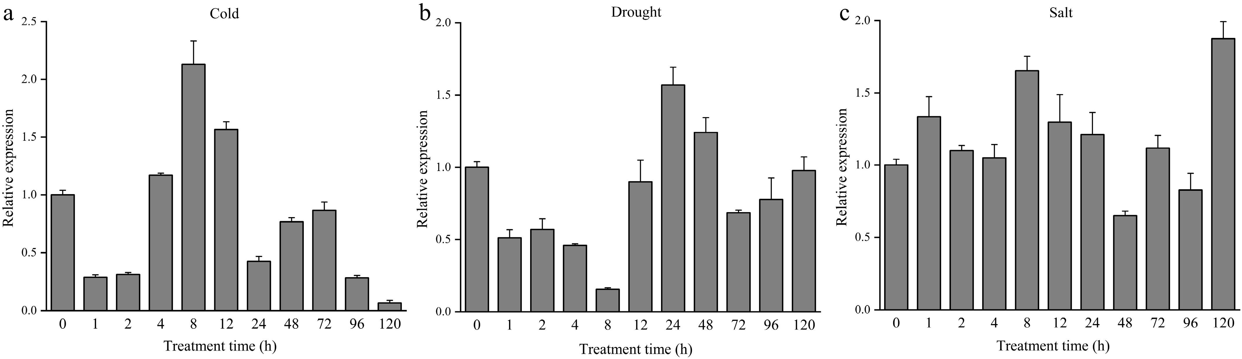 • To further investigate the potential roles of the DhCOR413PM1 in response to abiotic stress, transcript abundance was analyzed in leaves of middle-aged plantlets of Dendrobium Sonia 'Hiasakul' under low temperature (4 °C), drought (15% PEG-6000) and salt (50 mM NaCl) stress. Under 4 °C treatment, DhCOR413PM1 expression was initially suppressed (1–2 h) but strongly induced at 4–12 h. The highest expression level was observed at 8 h, reaching 2.13 times that of the control group (Fig. 3a). Under 15% (w/v) PEG-6000-induced osmotic stress, DhCOR413PM1 expression was significantly downregulated during 1–12 h, but upregulated at 24–48 h, peaking at 24 h with 1.57-fold induction compared to the control (Fig. 3b). Under 50 mM NaCl treatment, DhCOR413PM1 expression was rapidly upregulated within 1 h, followed by a slight decrease from 2–4 h. It peaked initially at 8 h, then gradually declined, ultimately reaching its highest level (1.88-fold higher than controls) at 120 h (Fig. 3c).