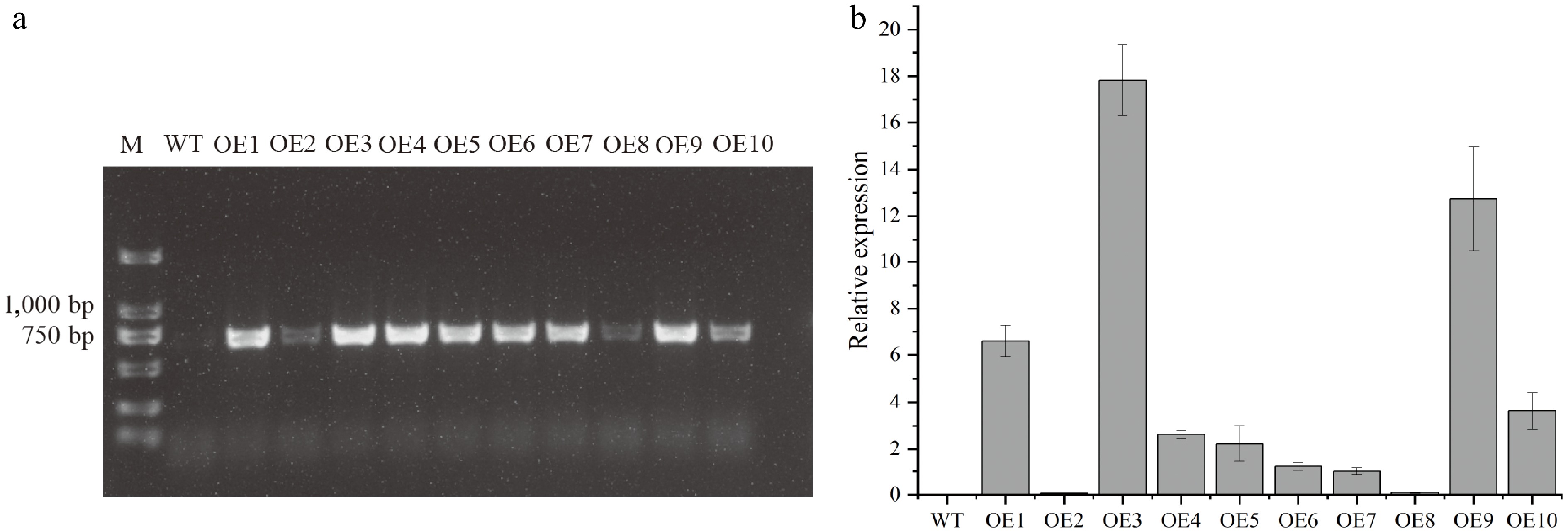 Transgenic validation and gene expression in Arabidopsis thaliana. (a) PCR verification of DhCOR413PM1 integration using CaMV35S promoter and gene-specific primers. M: Marker; WT: Wild-type; OE1–10: Independent transgenic lines. (b) DhCOR413PM1 transcript levels in T3 homozygous lines as quantified by qRT-PCR. Error bars represent ± SE of the three biological replicates.