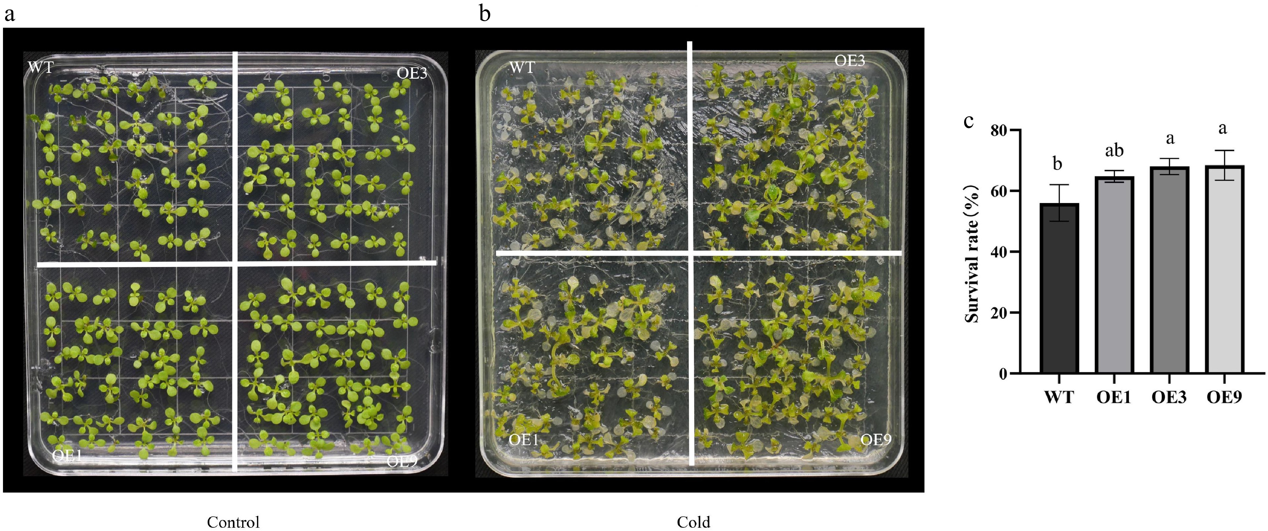 Freezing tolerance analysis of 35S::DhCOR413PM1 overexpressing Arabidopsis. (a) Phenotypes under non-stress conditions. (b) Phenotypes after freezing stress. (c) Survival rates after freezing stress. WT: wild-type; OE: 35S::DhCOR413PM1 overexpression lines. Error bars represent ± SE of the three biological replicates. Different letters above the bars indicate significant differences (p < 0.01) according to the DNMRT.
