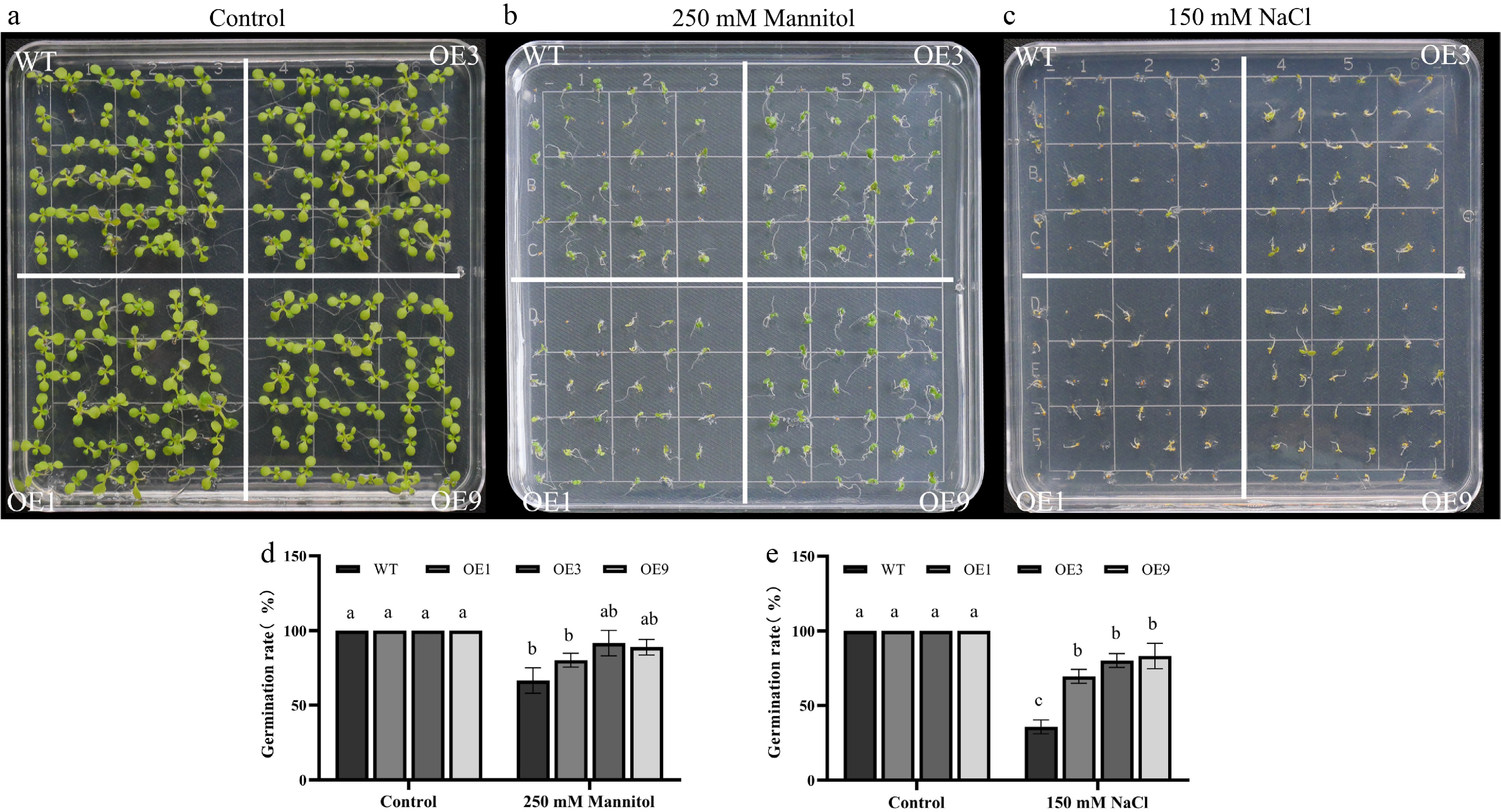 Drought and salinity tolerance of 35S::DhCOR413PM1 overexpressing Arabidopsis. (a) Phenotypes under control conditions. (b) Response to osmotic stress (250 mM mannitol). (c) Response to salt stress (150 mM NaCl). (d) Germination rates under osmotic stress. (e) Germination rates under salt stress. WT: wild-type; OE: 35S::DhCOR413PM1-overexpression lines. Error bars represent ± SE of the three biological replicates. Different letters above the bars indicate significant differences (p < 0.01) according to the DNMRT.
