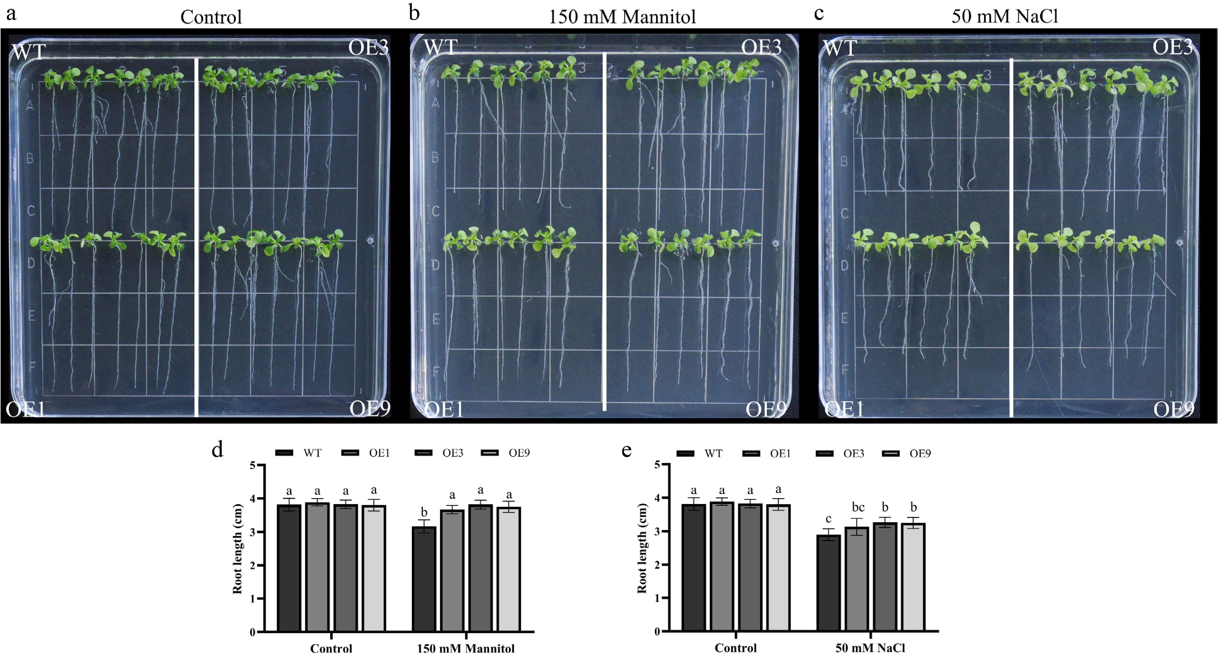 Root elongation analysis of 35S::DhCOR413PM1 overexpressing Arabidopsis under osmotic and salt stress. (a) Root growth status under normal conditions. (b) Response to osmotic stress (150 mM mannitol). (c) Response to salt stress (50 mM NaCl). (d) Primary root length under osmotic stress. (e) Primary root length under salt stress. WT: wild-type; OE: 35S::DhCOR413PM1 overexpression lines. Error bars represent ± SE of the three biological replicates. Different letters above the bars indicate significant differences (p < 0.01) according to the DNMRT.