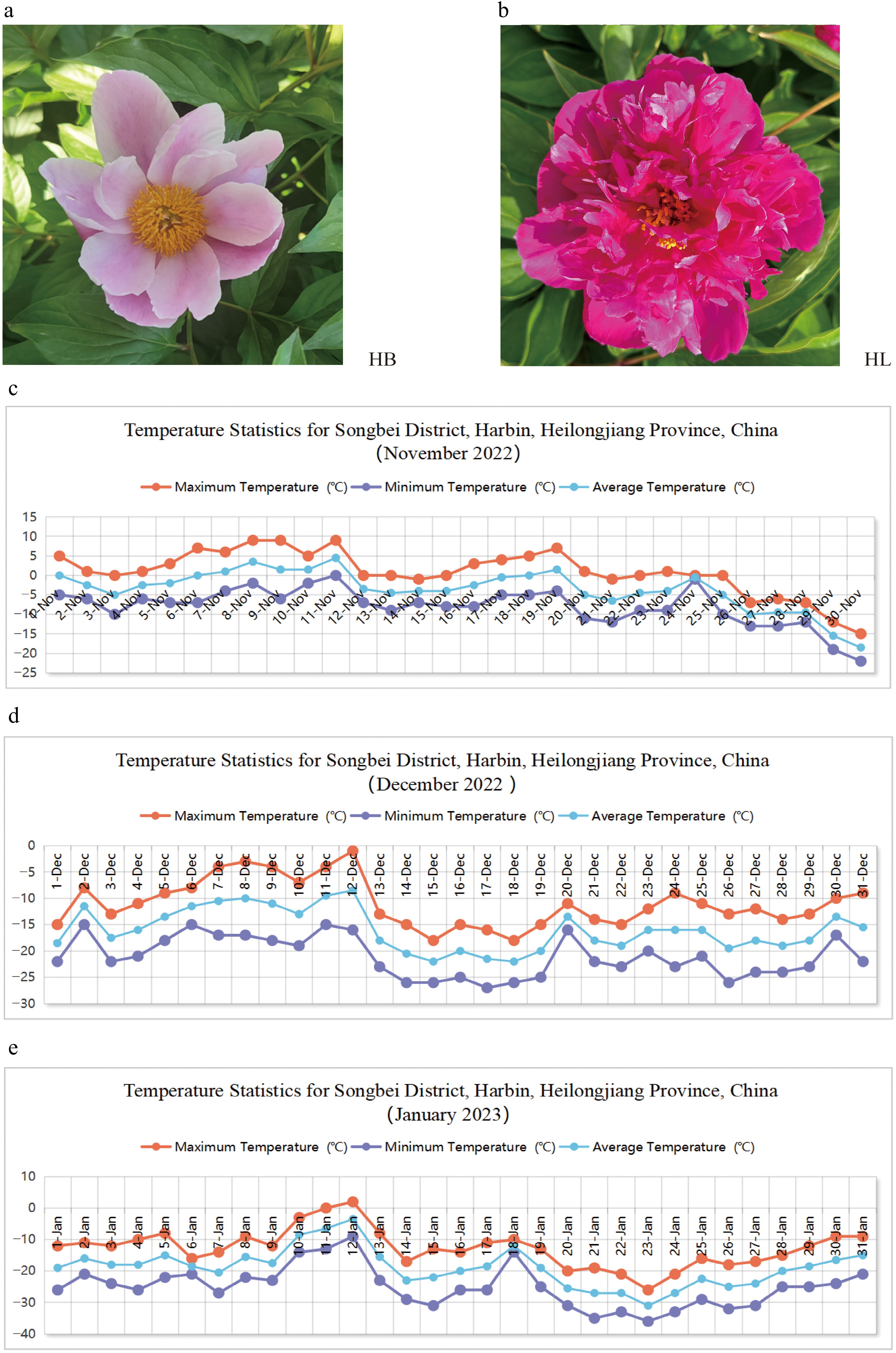• Two representative cultivars with contrasting provenance and cold tolerance were selected as experimental materials: 'Hang Baishao' (hereafter abbreviated as HB), an herbaceous peony cultivar originating from the lowest latitude region in China[24]. and 'Hongling Chijin' (hereafter abbreviated as HL), a cold-resistant cultivar of northern origin, identified through introduction and screening in Harbin (44°04′~ 46°40′ N, 125°42′~ 130°10′ E) (Fig. 1a, b, and Table 1). These two were introduced to the open experimental nursery of the Harbin Academy of Agricultural Sciences in Songbei District, Harbin, Heilongjiang Province, China. Daily temperatures during the period from November 2022 to January 2023 are all shown in Fig. 1ce, and the temperature data referenced in this analysis are accessible at https://tianqi.2345.com/. The buds of two cultivars in the underground frozen soil layer were sampled on November 10, 2022, December 10, 2022, and January 10, 2023. Three biological replicates per cultivar were collected at each sampling stage. All samples were immediately frozen in liquid nitrogen and stored at −80 °C for subsequent experiments.