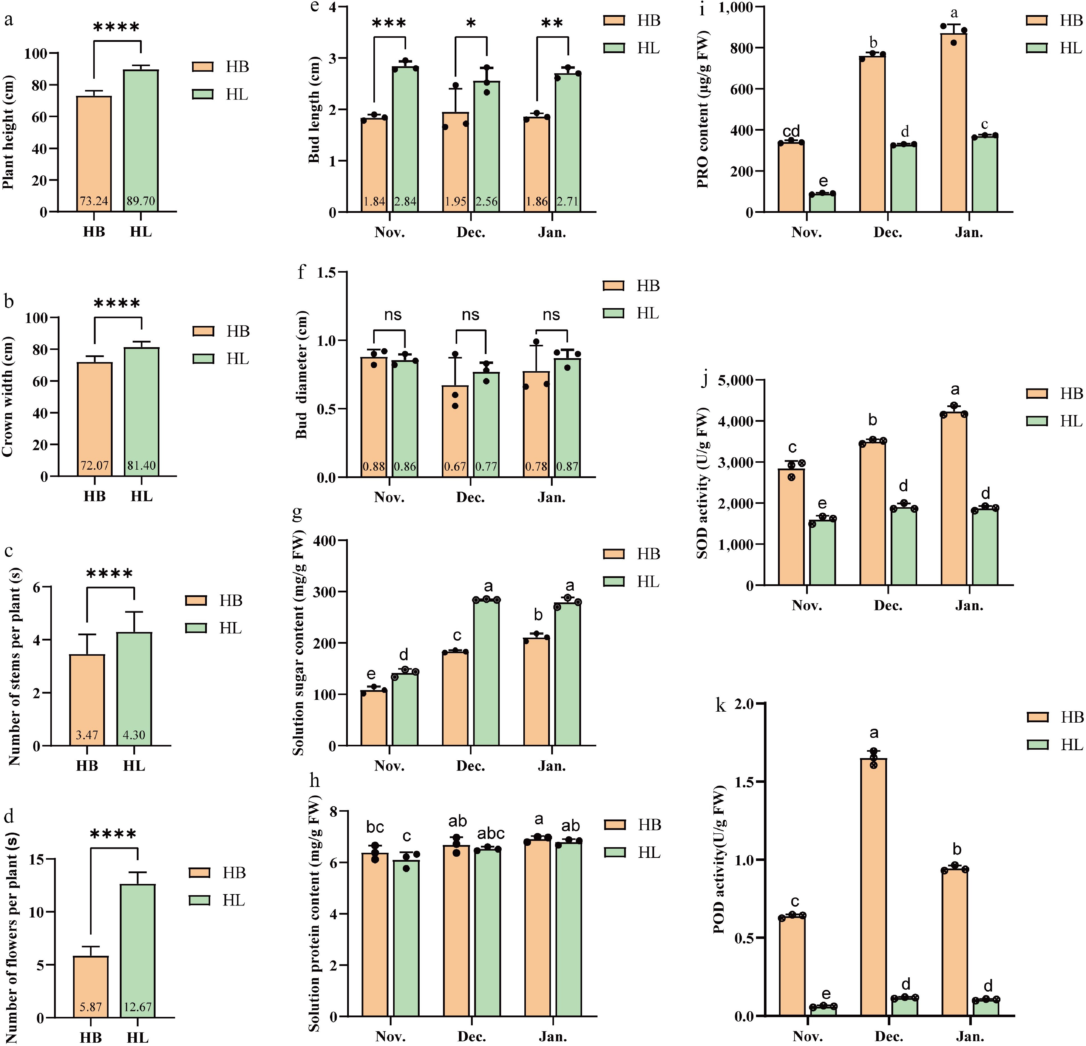Meanwhile, cold treatment significantly increased soluble sugar content in both sugarcane (Saccharum officinarum L.) varieties (ROC22 and GT42), with GT42 showing greater accumulation and higher cold resistance than ROC22 at the bud stage[35]. Furthermore, salicylic acid treatment enhanced cold hardiness in Magnolia wufengensis by increasing soluble sugar accumulation, which improves freezing tolerance during natural cold acclimation[36]. In this study, HL demonstrated significantly superior morphological characteristics. These included longer bud length, greater plant height, larger crown width, increased stem number per plant, and higher flower count per individual. HL also has significantly higher soluble sugar content compared to HB, showing its stronger cold resistance, demonstrating the critical role of soluble sugars in mediating plant adaptive responses to cold stress (Fig. 2ae, g). These results are consistent with previous studies conducted in sugarcane and Magnolia wufengensis[35,36]. The enriched starch and sucrose metabolism pathways likely facilitated increased soluble sugar levels through enhanced starch hydrolysis, thereby enhancing cold stress resistance in herbaceous peony.