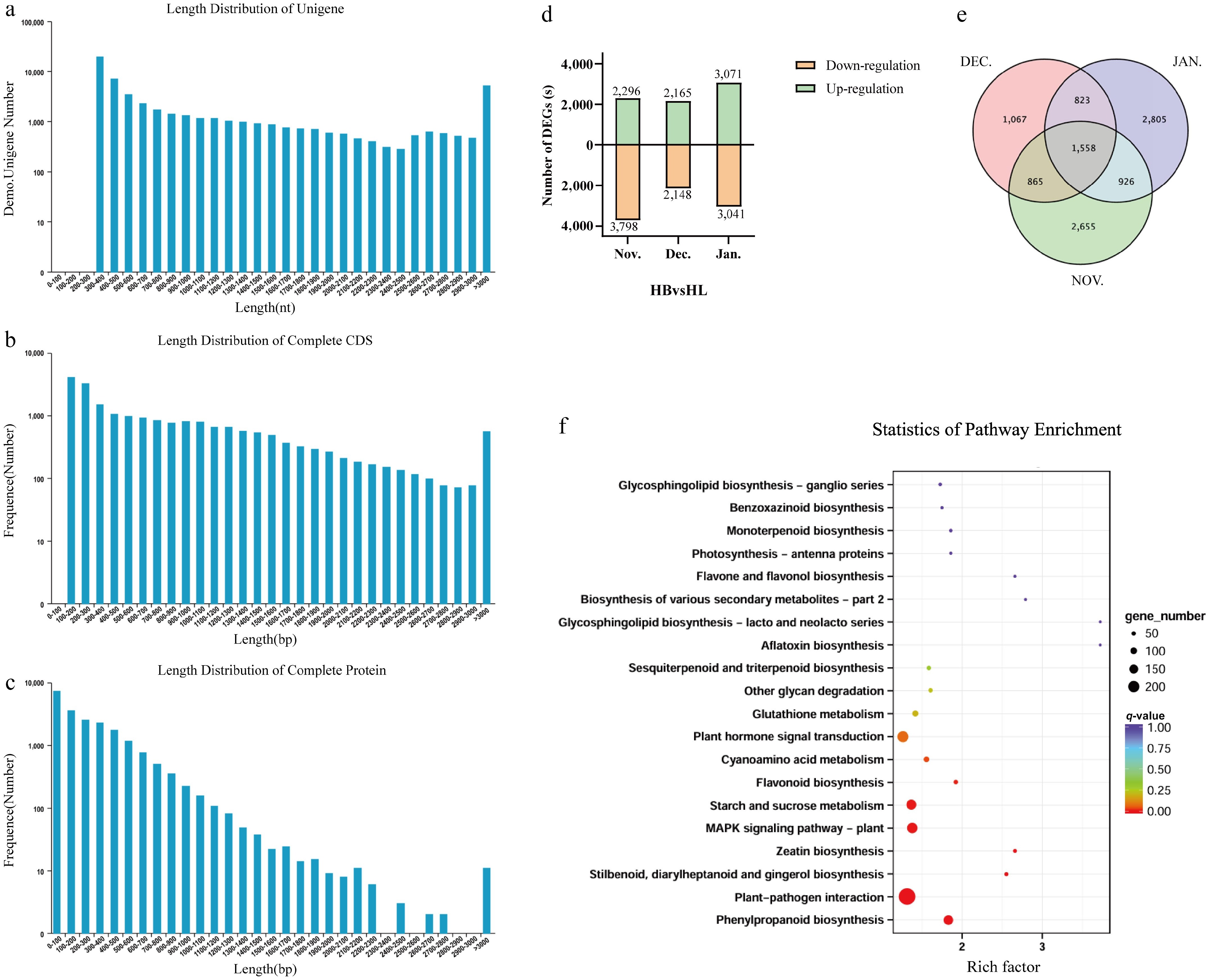 • The experimental samples, consisting of three biological replicates each of HB and HL collected during three winter periods (November 2022 to January 2023), were processed for transcriptome analysis. All samples were shipped to the Biomarker Technologies Corporation (Beijing, China) for the transcriptome library construction and sequencing using the Illumina NovaSeq 6000 platform with PE150 sequencing mode. Sequence assembly was conducted via Trinity (v 2013), yielding 55,498 assembled transcripts (Unigenes or genes). Sequences of these transcripts were aligned against the NCBI non-redundant protein database (NR), Swiss-Prot, Clusters of Orthologous Groups (COG), Eukaryotic Orthologous Groups (KOG), evolutionary genealogy of genes: Non-supervised Orthologous Groups (eggNOG 4.5), and Kyoto Encyclopedia of Genes and Genomes (KEGG) databases by using DIAMOND software. KEGG Orthology (KO) annotations were obtained through KOBAS. Gene Ontology (GO) analysis was performed using InterProScan with integrated InterPro databases. Amino acid sequences of Unigenes were predicted and aligned against the Pfam database via HMMER software to acquire functional annotations.