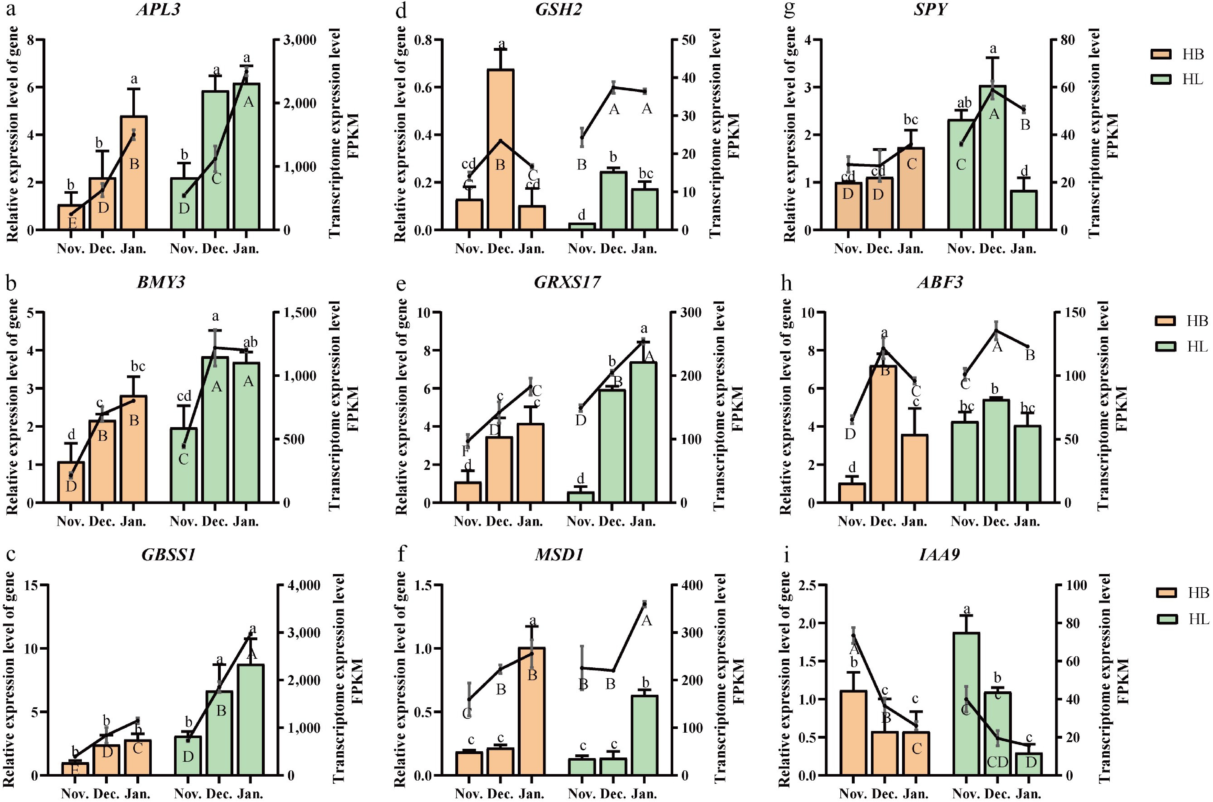 • Plants employ diverse molecular strategies to enhance cold tolerance, involving key genes that regulate sugar metabolism, redox homeostasis, and phytohormone signaling. Specifically, APL3 in Spirodela polyrhiza promotes starch accumulation to support turion formation and energy storage[49]. While BMY3 in rhubarb (Rheum rhabarbarum L. Polygonacea family) facilitates starch-to-sugar conversion to enable dormancy release and cold adaptation[50]. GSH2 enhances chilling tolerance in species like tomato by synthesizing glutathione to mitigate oxidative stress, dependent on energy availability and regulatory cascades. Similarly, GRXs in tea plant (Camellia sinensis (L.) Kuntze) and banana (Musa acuminata) maintain redox balance under low-temperature stress, with members like MaGRX17 specializing in antioxidative defense[51,52]. APL3, BMY3, and GRXS17 all exhibited increased expression levels in both HL and HB under progressively severe cold stress, with even higher expression observed in the more cold-tolerant cultivar HL (Fig. 5a, b, e). This indicates their active roles in responding to cold stress, consistent with the functions of their orthologs in Spirodela polyrhiza, rhubarb, banana, tomato, rice, and tea plant[4952].