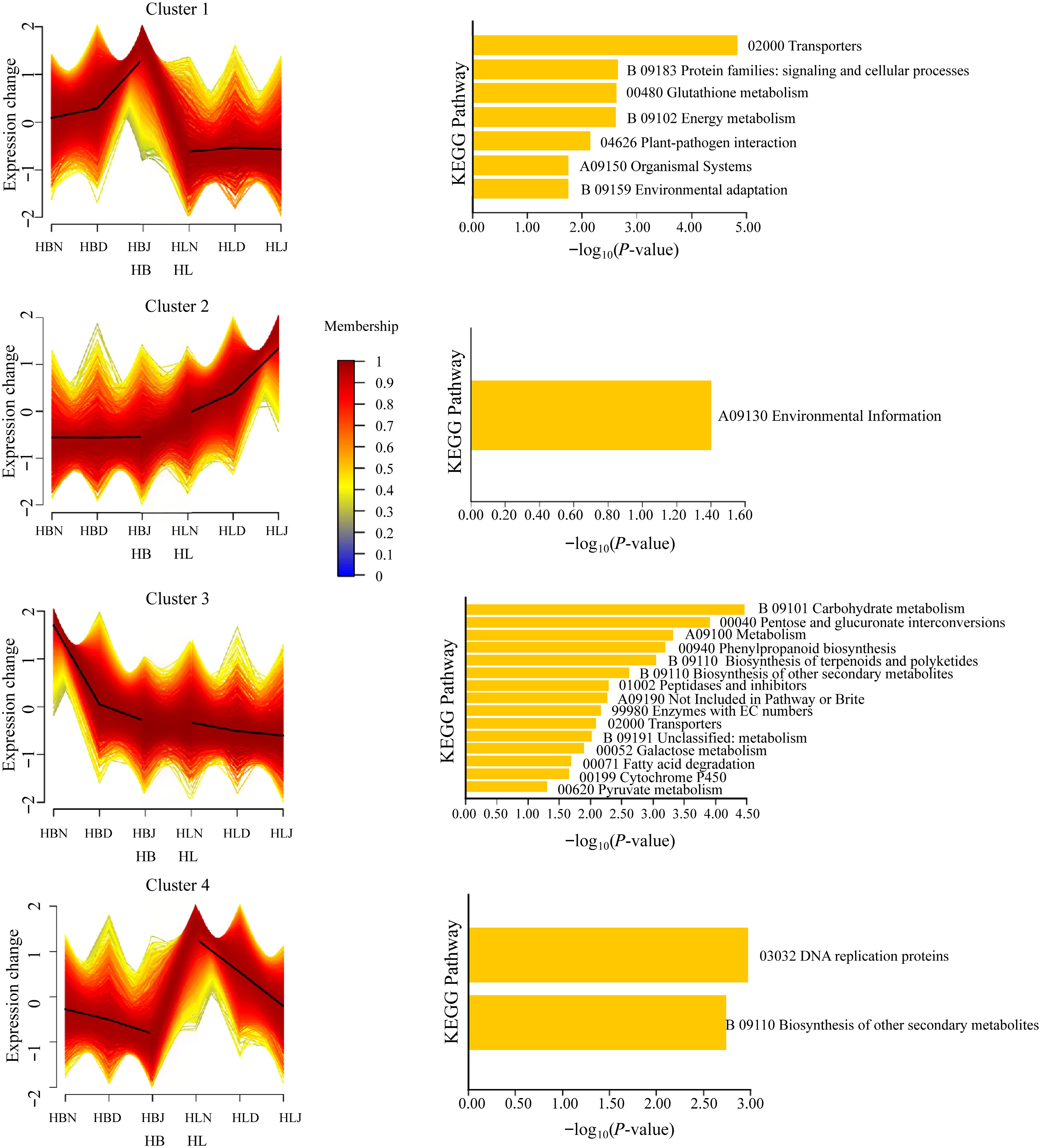 • To further explore the expression patterns of DEGs in HB and HL during the three periods, all DEGs were divided into four clusters, presenting four trends (Fig. 6): with the temperature drop, Cluster 1 was highly expressed in HB, where it increased, but showed no significant change in HL. Cluster 2 increased and was highly expressed in HL, but showed no significant change in HB. Cluster 3 decreased in both HB and HL, but was highly expressed in HB. Cluster 4 decreased in both HB and HL, but was highly expressed in HL.