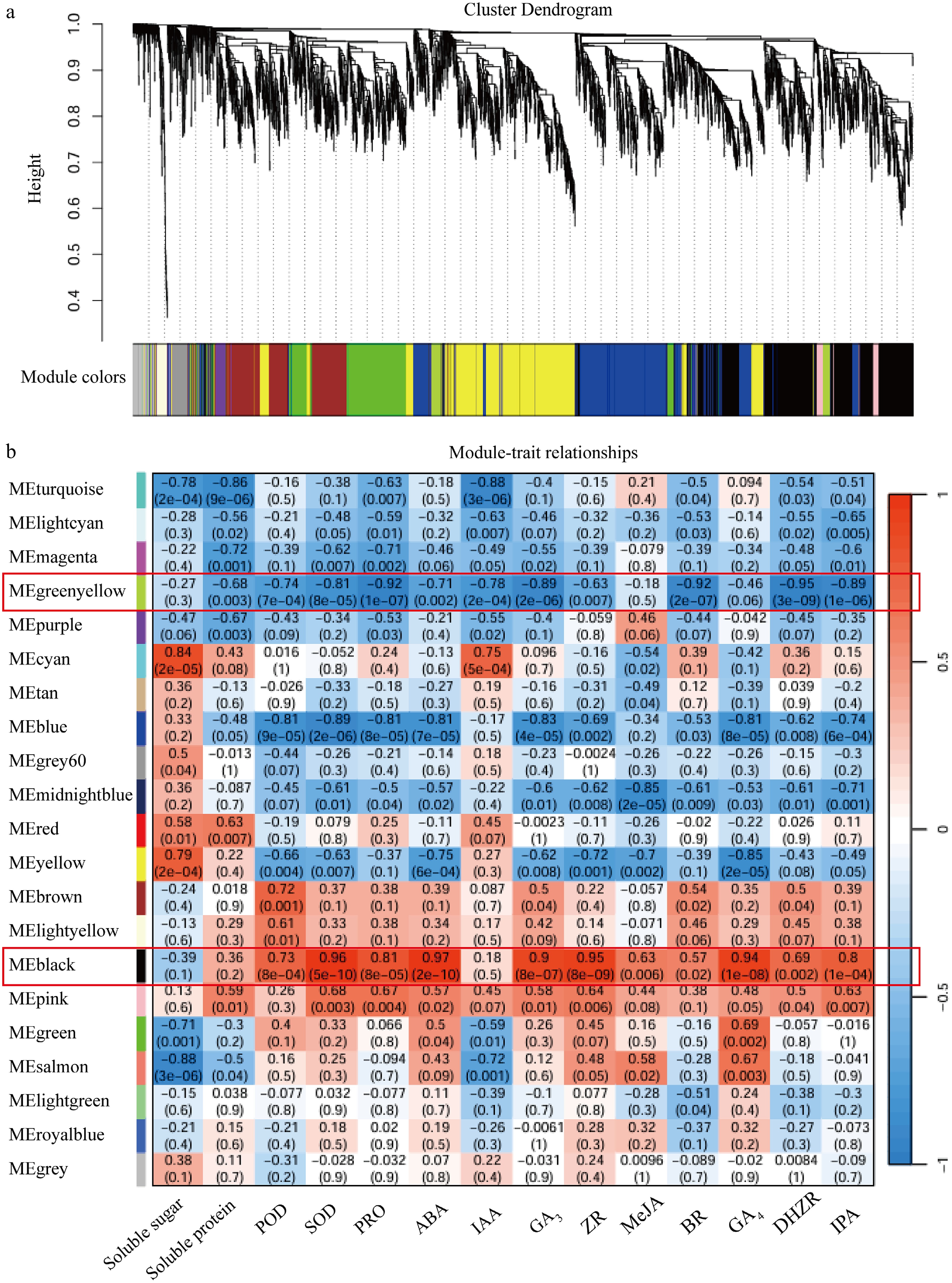 • To further determine the specific modules and genes related to cold resistance-related traits between HB and HL, a WGCNA analysis was conducted. This analysis combined transcriptome sequencing data with 14 physiological indicators. These indicators, which included levels of soluble sugar, antioxidant enzyme activity, and phytohormone contents, were obtained from previous observations (Figs 2gk, 3). Results show that 21 different modules were obtained. Analysis of the relationship between the module characteristic genes and physiological parameters related to cold resistance indicate that ME black is significantly positively correlated with POD, SOD, PRO, ABA, GA3, ZR, GA4, and IPA; while ME greenyellow is significantly negatively correlated with solution protein, POD, SOD, PRO, ABA, IAA, GA3, BR, DHZR, and IPA (Fig. 7).