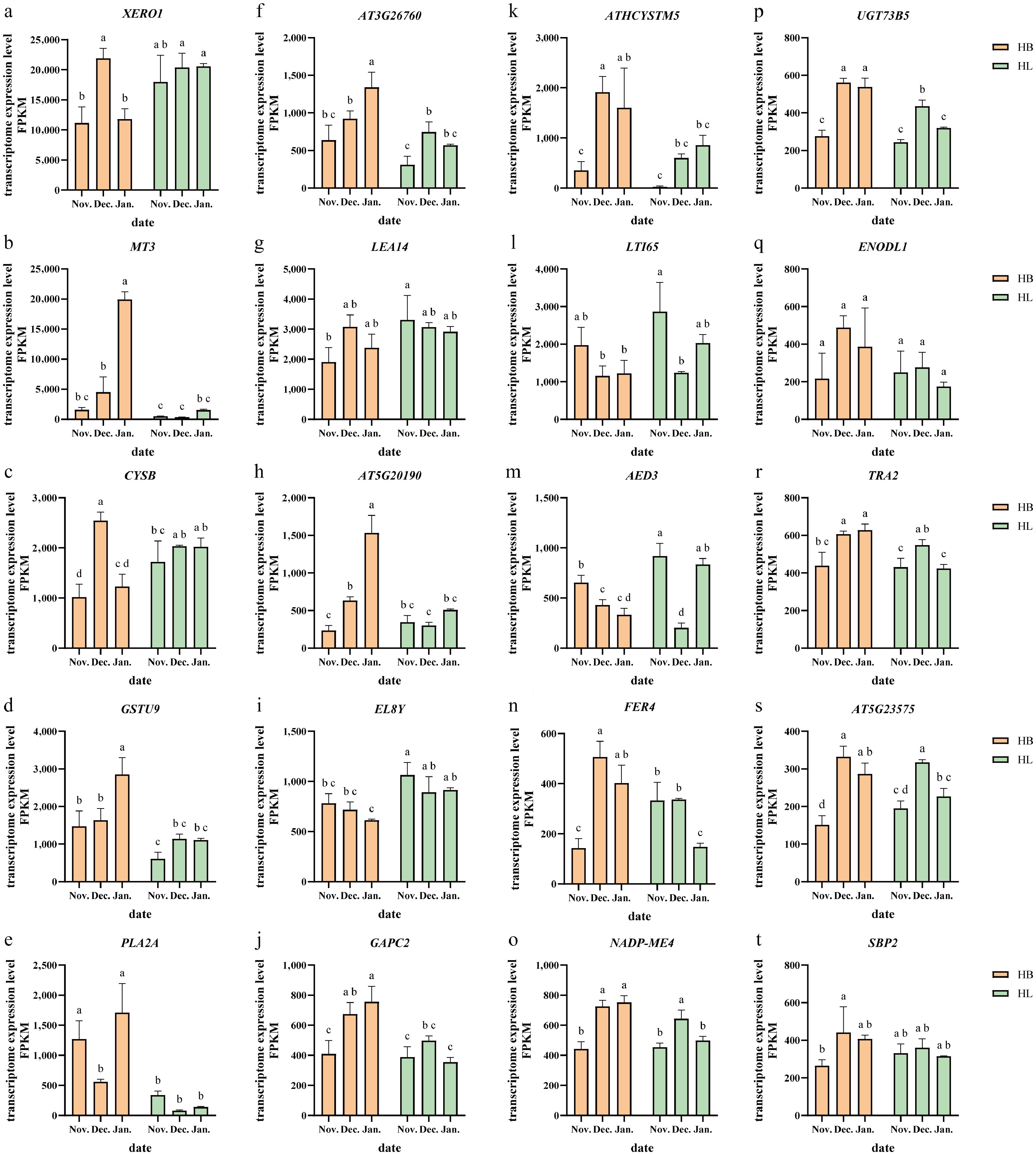 Transcriptome expression levels of genes potentially involved in cold stress response are shown for 'Hang Baishao' (HB) and 'Hongling Chijin' (HL). (a)–(j) Genes from Me black modules, and (k)–(t) Me greenyellow modules are displayed in the left and right panels, respectively. Different lowercase letters above the bars of (a)–(t) show significant differences at the 0.05 probability level; n = 3.