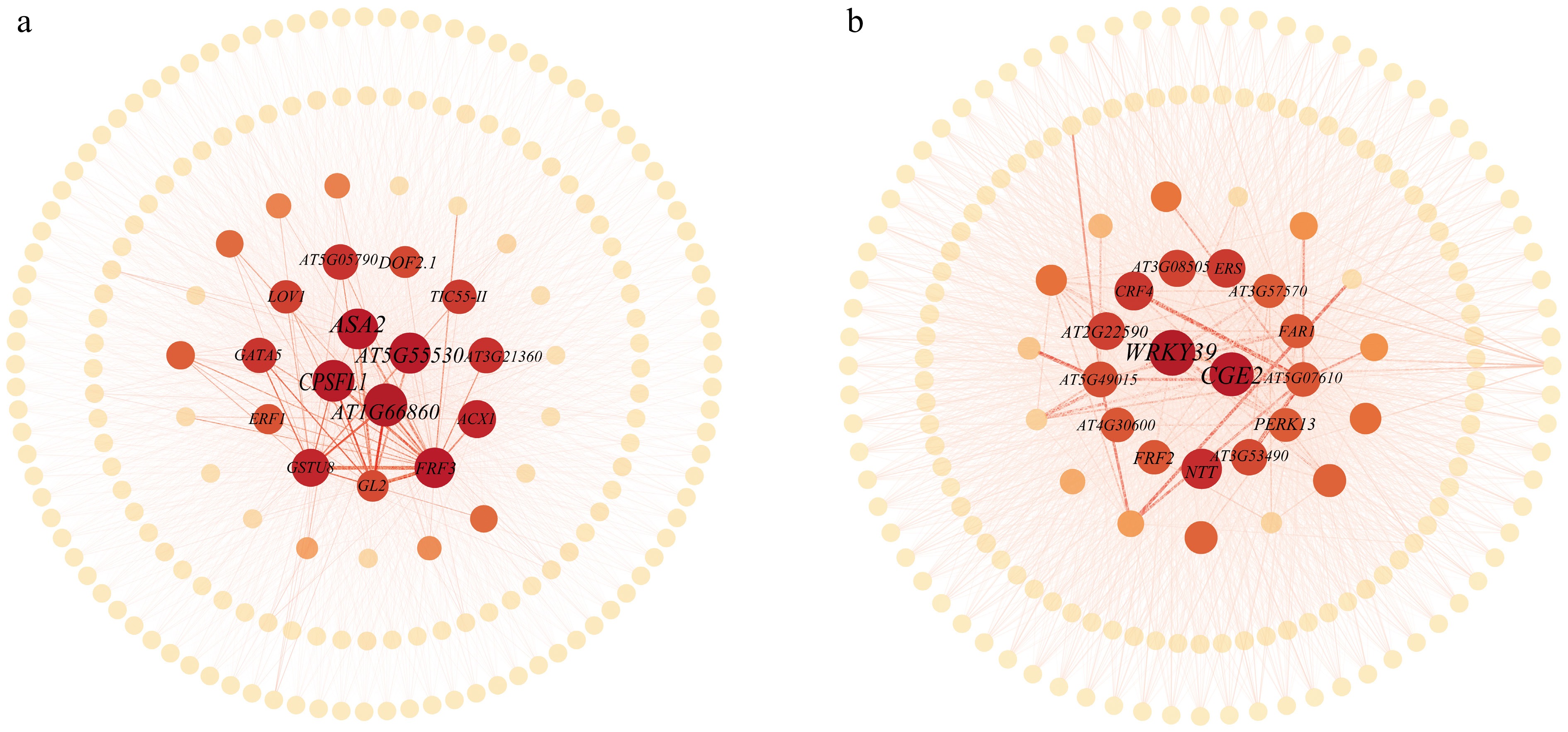 Within the ME yellowgreen module, the gene with the highest degree value is WRKY DNA-BINDING PROTEIN 39 (WRKY39). This gene is a member of the WRKY transcription factor family and is a well-studied transcription factor gene known for its role in plant stress resistance. The CHLOROPLAST GRPE 2 (CGE2) gene also ranked high in degree, suggesting its importance in chloroplast protein import and plastid-to-nucleus signaling during cold adaptation. The emergence of these highly connected hub genes suggests that cold tolerance in herbaceous peony may be coordinated through the integration of multiple synergistic mechanisms.