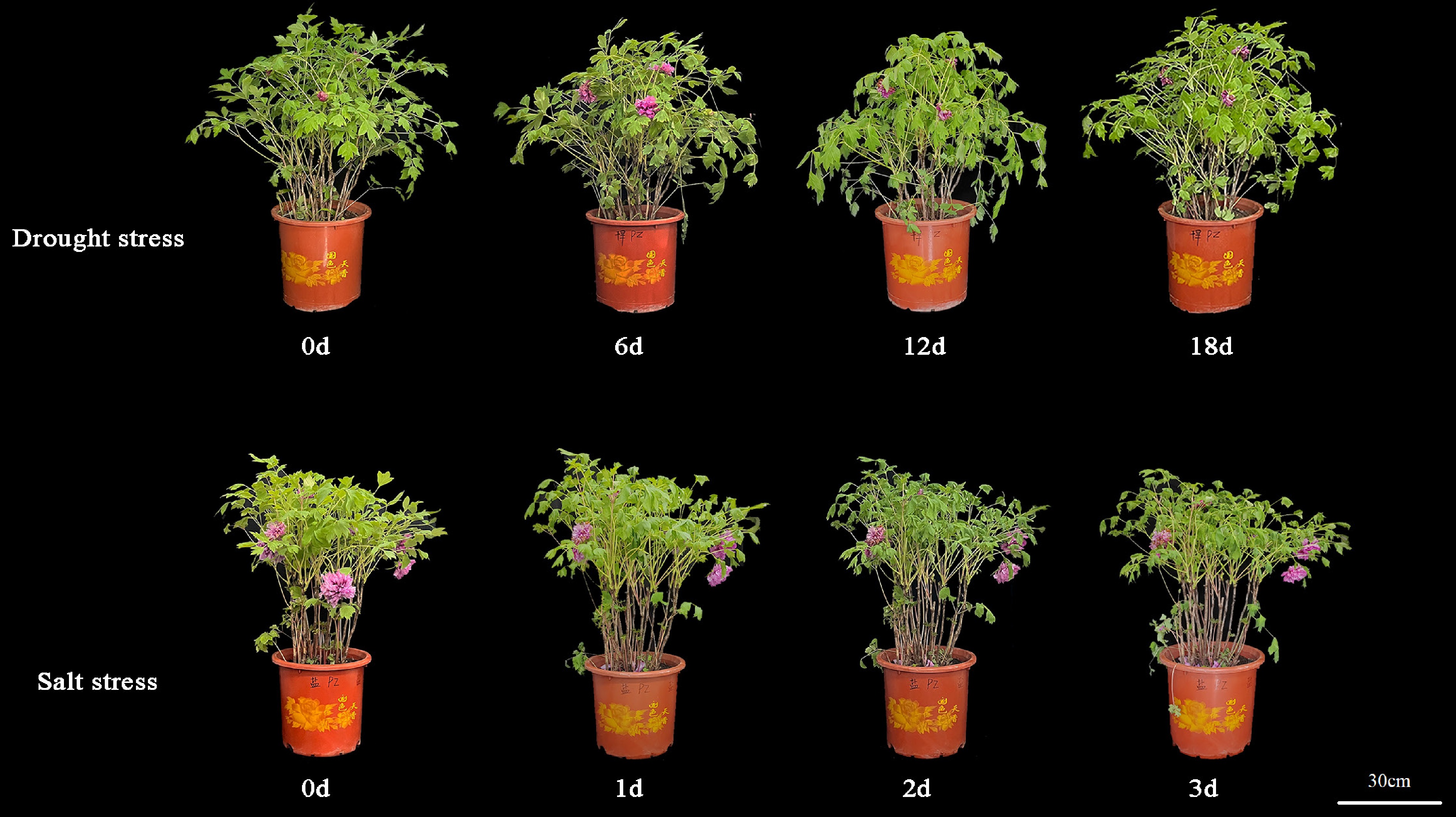 Morphological differences of P. suffruticosa 'Luoyang Hong' plants under drought and salt stress. The numbers indicate days after treatment. The horizontal bar represents 30 cm.