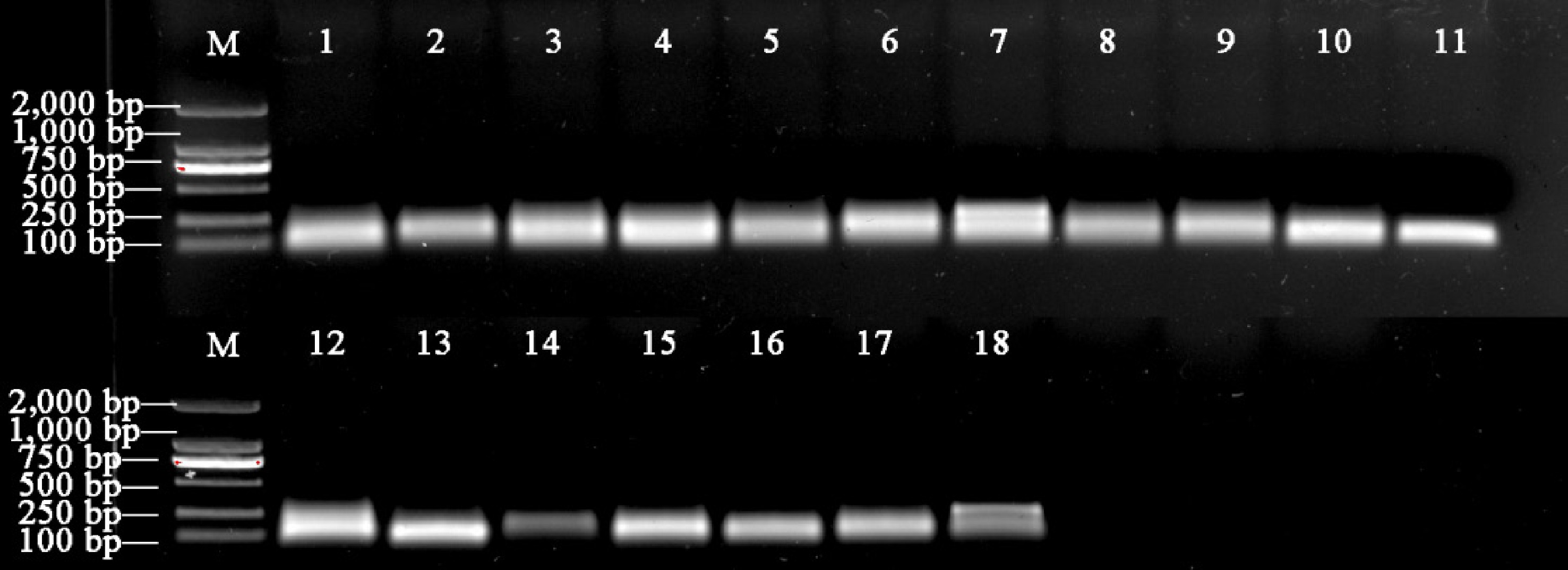 Amplified gel electrophoresis of 18 candidate RGs in Table1. M: 2,000 bp Marker; 1−18: miRNAs in Table 1 and the order are kept consistent.