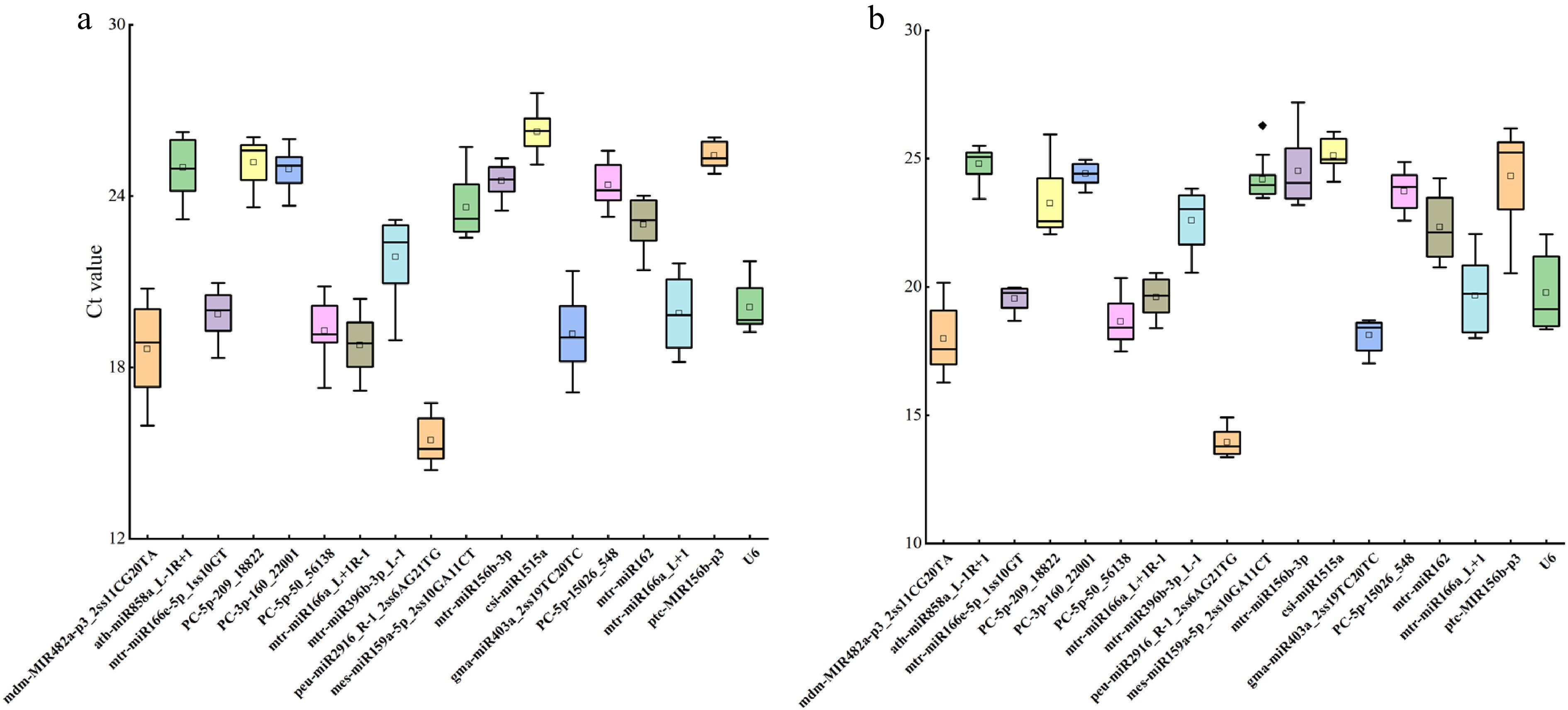 In this study, leaves of P. suffruticosa 'Luoyang Hong' subjected to varying degrees of drought and salt stress were used as materials. Based on miRNA sequencing data[21], 17 miRNAs with relatively stable expression were selected as candidates. Using the commonly applied snRNA U6 as a reference, their expression stability was assessed by qRT-PCR and systematically evaluated with four algorithms: geNorm, NormFinder, BestKeeper, and RefFfinder.