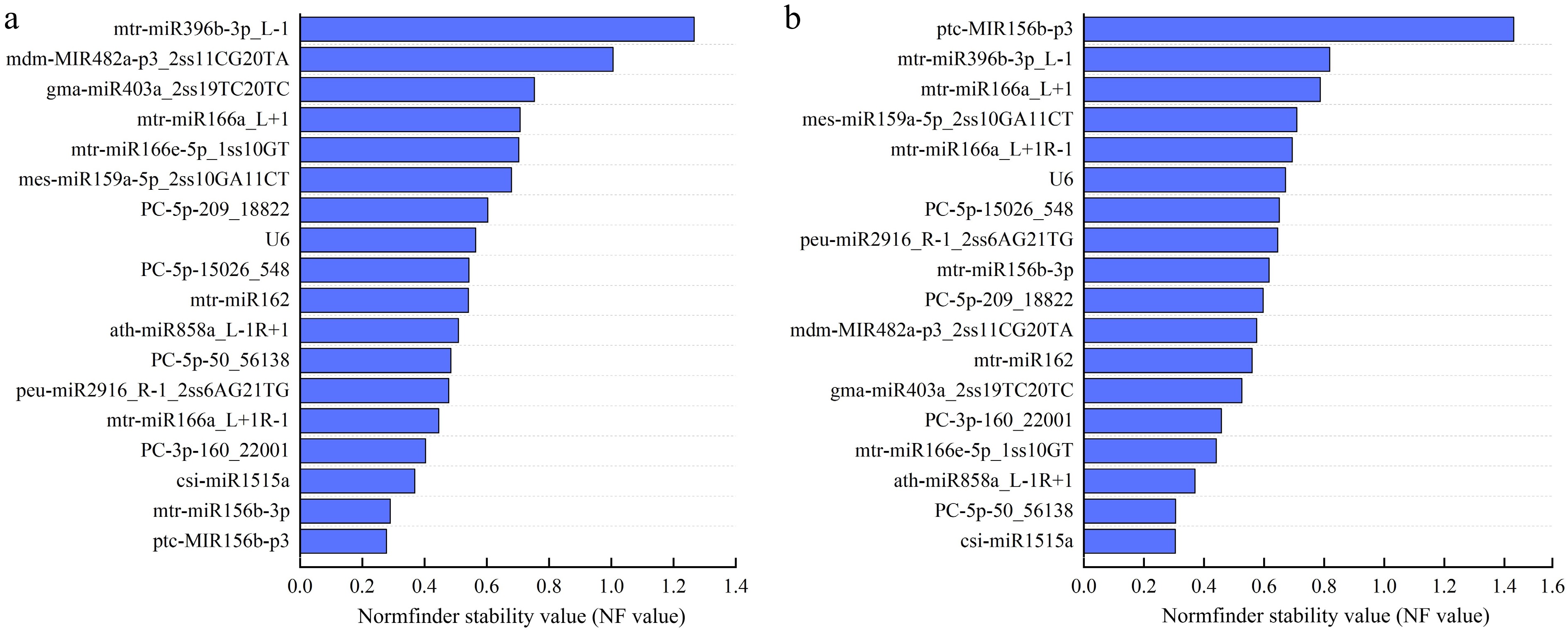 • The RefFinder analysis provides a comprehensive evaluation and ranking of the stability of ER genes obtained from the GeNorm, NormFinder, and Bestkeeper software. The analysis results indicate that under drought stress (Table 4), ptc-MIR156b-p3 is the most stable, which is consistent with the results from NormFinder and Bestkeeper. The next most stable miRNAs are mtr-miR156b-3p and mtr-miR166a_L+1R-1, which align with the most stable miRNAs predicted by GeNorm. The least stable miRNA is mtr-miR396b-3p_L-1, which is consistent with the results from GeNorm and NormFinder, and it also has a low score in Bestkeeper. Overall, the high similarity among the results from the four software programs suggests that the findings are quite reliable.