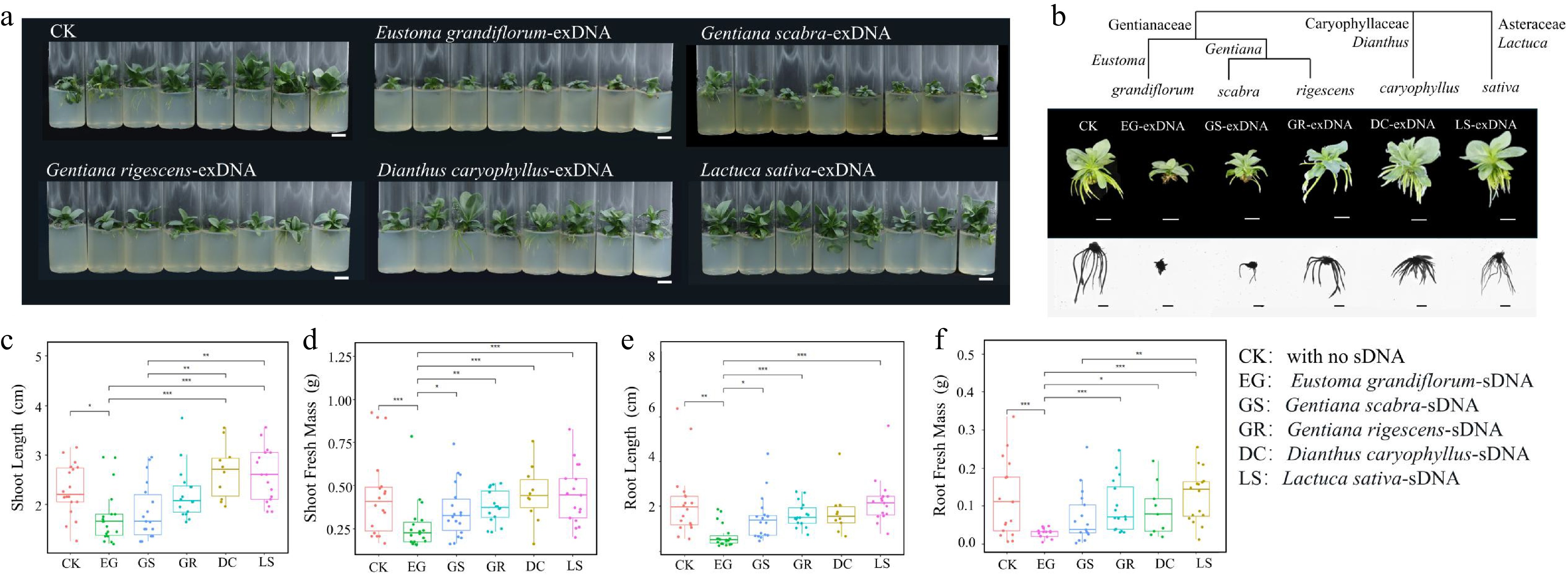 Examination of species-specific inhibition of extracellular fragmented DNA (exDNA) in lisianthus plants. (a) Overall growth of lisianthus plants after 3 week exposure with 200 μg/mL exDNA from different species: Control with no exDNA addition (CK), Eustoma grandiflorum (EG), Gentiana scabra (GS), Gentiana rigescens (GR), Dianthus caryophyllus (DC), and Lactuca sativa (LS). (b)Phenotypic differences of individual plants from six groups along with the species phylogenetic relatedness. And morphological comparisons (mean ± SE, n = 12) in above- and below-ground traits among the six groups. (c) Shoot length. (d) Shoot fresh mass. (e) Root length. (f) Root fresh mass. Different symbols above the error bars indicated significant differences among the six groups based on Tukey multiple comparison test (n = 10, p < 0.05). * Indicated p-value < 0.05, ** indicated p-value < 0.01, *** indicated p-value < 0.001.