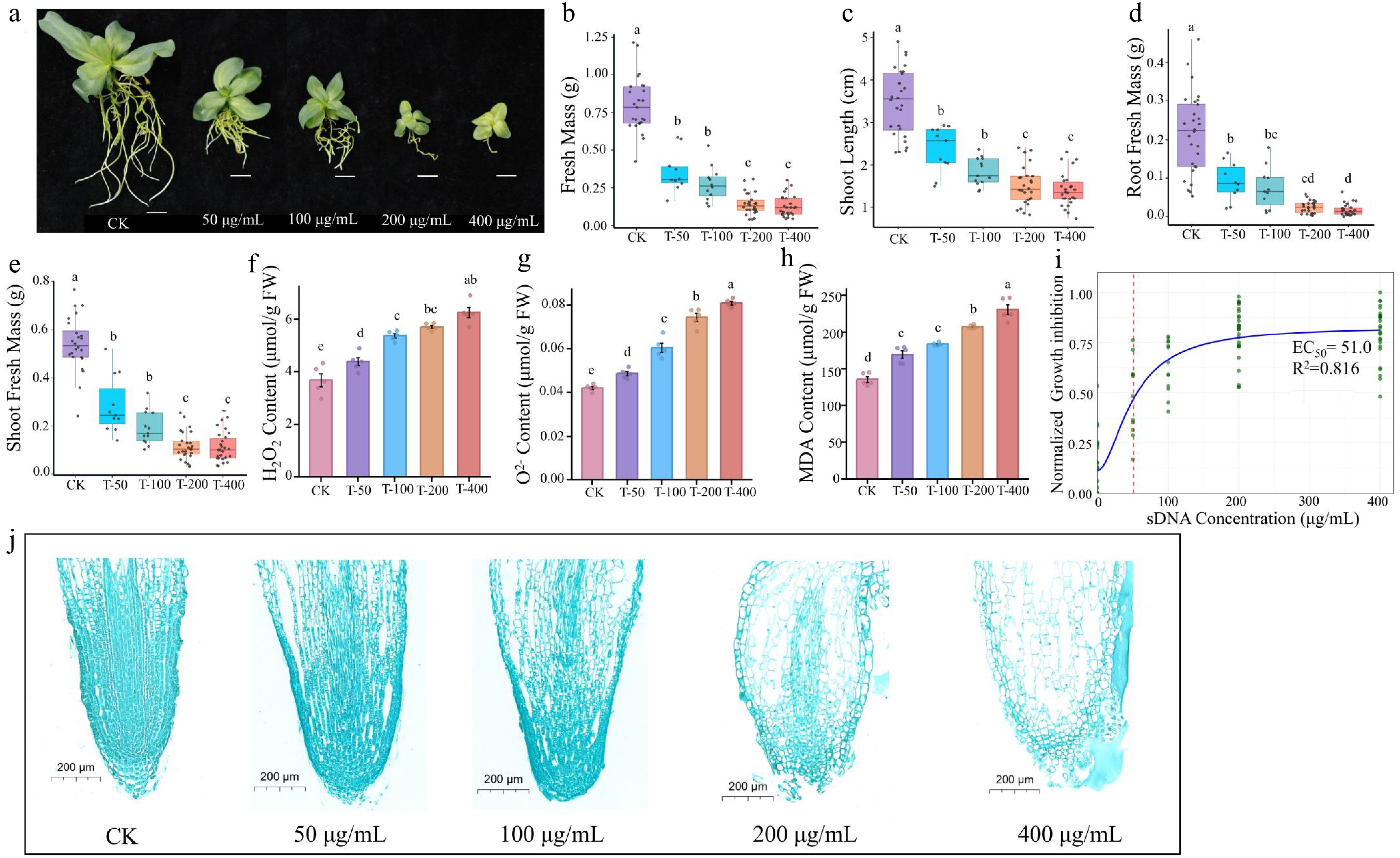 Ecotoxicity effect of sDNA ranging from 0, 50,100 to 200 and 400 μg/mL on lisianthus. (a) Phenotypic images of seedlings under different sDNA treatments. From left to right: CK, T-50, T-100, T-200, T-400 treatment groups (scale bar = 1 cm). The growth inhibition and physiological responses with increasing concentration included (b) shoot length, (c) shoot fresh biomass, (d) root fresh biomass, (e) total fresh mass, (f) hydrogen peroxide (H2O2) content, (g) superoxide anion (O2) concentration, and (h) malondialdehyde (MDA) accumulation. Different lowercase letters (a, b, c, d) above bars indicate significant differences among treatment groups (n = 10, p < 0.05, one-way ANOVA followed by Duncan's multiple range test). 'CK' represents the control group without sDNA treatment; 'T-50', 'T-100', 'T-200', and 'T-400' denote treatment groups with final sDNA concentrations of 50, 100, 200, and 400 μg/mL, respectively. (i) Dose-response curve of sDNA on growth inhibition. The y-axis indicates the normalized growth inhibition (0–1 range, processed using min-max normalization with negative values set to 0). Green dots represent normalized experimental data points, and the blue solid line denotes the fitted curve. The red dashed line marks the EC50 position (51.0 µg/mL). Microstructure of root tip stained with safranin and fast green (scale bar = 200 μm) from different exposure concentrations were shown in (j).