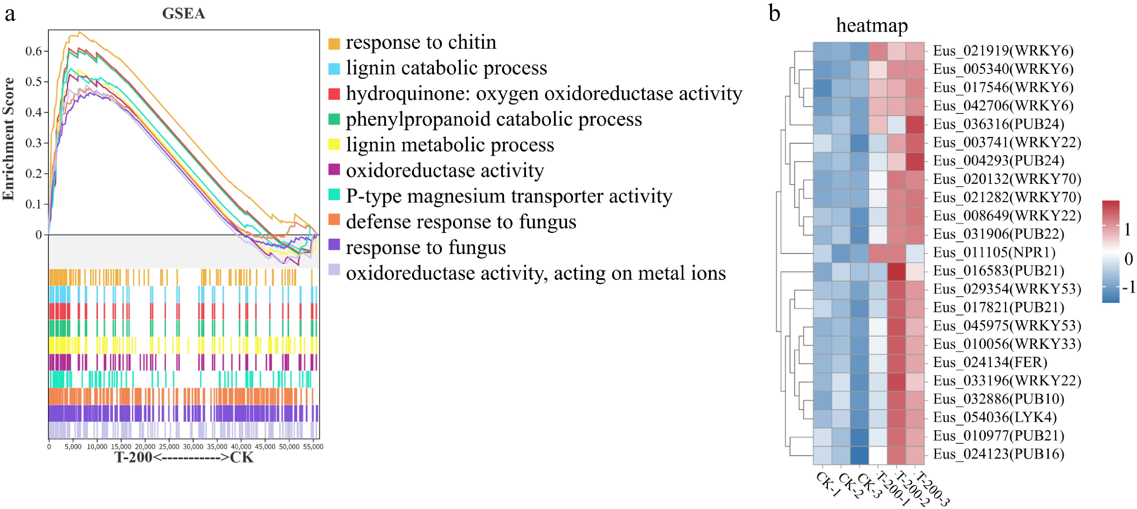 • Gene Set Enrichment Analysis (GSEA) confirms at the pathway level that lisianthus roots systemically respond to sDNA stress by coordinately activating key biological processes, including immune defense, redox regulation, and metabolic reorganization. GO enrichment analysis revealed broad transcriptional reprogramming upon sDNA treatment, with a general downregulation of genes involved in basic cellular and metabolic processes, alongside the activation of stress-responsive terms (Supplementary Fig. S3, Supplementary Text 2). To systematically decipher the underlying molecular mechanisms, GSEA was performed comparing the T-200 treatment and control (CK). As shown in Fig. 3a, the GSEA plot shows that gene sets such as 'response to chitin', 'lignin catabolic process', and 'hydroquinone: oxygen oxidoreductase activity' were significantly enriched in the T-200 group (NES > 1, FDR < 0.05). The coordinated upregulation of these pathways suggests that lisianthus roots may recognize sDNA as a danger signal analogous to pathogen infection, thereby activating classic immune defense pathways like the chitin response and lignin metabolism. Concurrently, the enrichment of genes related to oxidoreductase activity correlates with the accumulation of reactive oxygen species observed in prior physiological experiments, collectively indicating that sDNA may exacerbate cellular damage by inducing oxidative stress. Furthermore, other significantly enriched gene sets in the plot (e.g., cellular response to fungus, aerobic respiration) further corroborate the immune response and energy metabolic reprogramming triggered by sDNA stress. All significantly enriched gene sets had a Normalized Enrichment Score (NES) greater than 1.5 and a False Discovery Rate (FDR) less than 0.05, confirming the statistical reliability of the results.