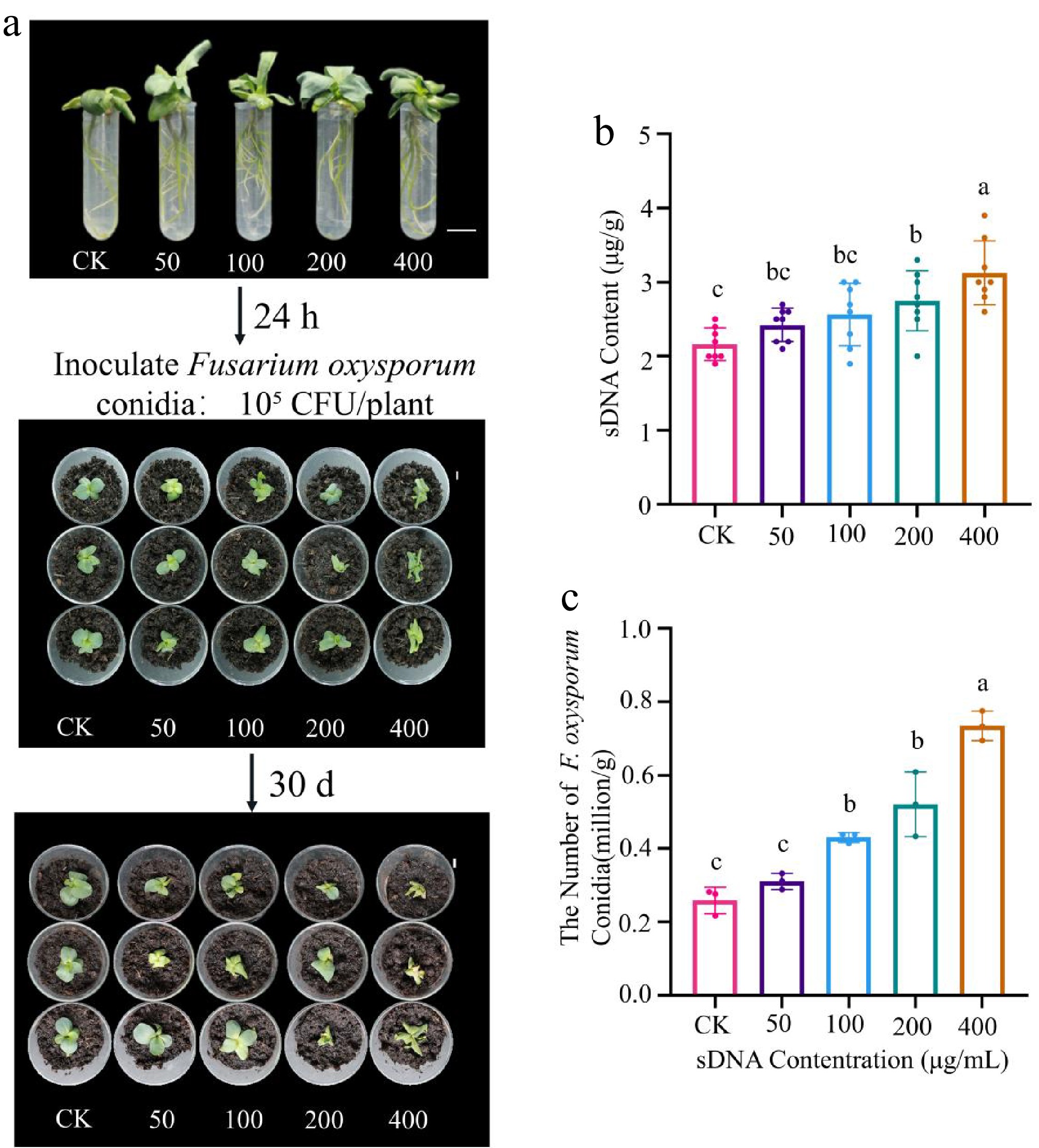 • Lisianthus sDNA was fragmented and diluted to concentrations of 50, 100, 200, and 400 μg/mL as above-mentioned. 3-week-old seedlings with similar sizes as mentioned above, were exposed in the sDNA with their roots immersed in the respective sDNA solutions for 24 h, with a control group (CK) treated with distilled water. Each of the five groups included 10 replicates. Seedlings were then transplanted into sterilized cups (height: 5 cm; volume: 200 mL) filled with sterilized Pindstrup peat (0–10 mm particle size, pH 5.5–6.0; Pindstrup Mosebrug A/S, Denmark). The seedlings from all groups were treated with 5 mL of the spore suspension after 3 d acclimation.
