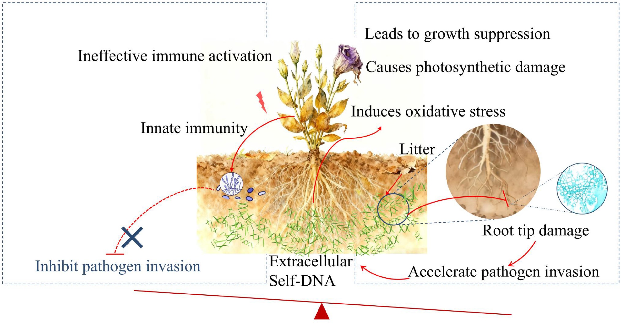 Schematic diagram depicting the proposed mechanism of sDNA-mediated negative plant-soil feedback in lisianthus. Self-DNA released from accumulated root litter in the soil acts as a danger signal, activating the innate immune system and potentially enhancing pathogen resistance. Simultaneously, it induces oxidative stress and inhibits basic metabolic processes like photosynthesis, leading to root damage and reduced plant fitness. Crucially, the beneficial effects of immune activation are likely overridden by the growth-inhibitory and damaging effects, ultimately predisposing the plant to accelerate pathogen invasion and establishing a vicious cycle characteristic of soil sickness.