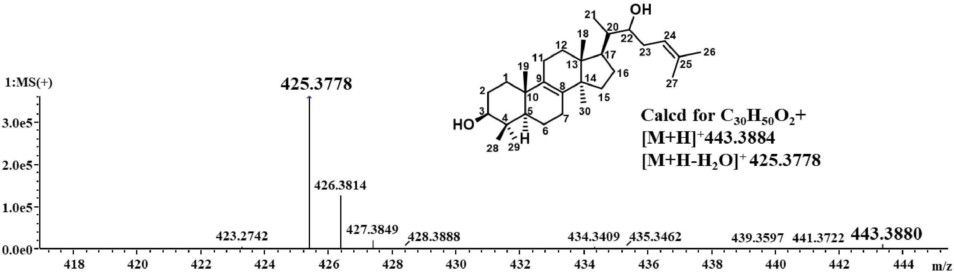 • Inotodiol is a unique compound found in I. obliquus, notable for its distinct structure, which exhibits enhanced polarity, an attribute attributable to its two hydroxyl groups, one of which is added at C-22 relative to lanosterol. However, inotodiol is usually present in low concentrations, making its extraction and isolation quite challenging. In this study, we used rice as the growth medium for solid-state fermentation, incubating it for 20 d prior to extracting the compounds with ethyl acetate. Thin-layer chromatography analysis showed a distinct spot, indicating a compound with higher polarity than lanosterol. Then, silica gel chromatography and semi-preparative HPLC were used for further purification, and 10 mg of pure inotodiol was obtained. This purified compound was dissolved in ClCD3 for nuclear magnetic resonance (NMR) analysis, The results confirmed the identity of the compound as inotodiol. 13C NMR (126 MHz) δC 135.17, 134.58, 134.20, 121.35, 78.99, 73.39, 50.40, 49.41, 47.27, 44.87, 41.69, 38.90, 37.04, 35.59, 30.97, 30.97, 29.12, 27.97, 27.85, 27.25, 26.52, 25.99, 24.31, 21.01, 19.14, 18.25, 17.99, 15.69, 15.42, 12.62.1H NMR (500 MHz, Chloroform-d) δH 5.18 (t, J = 7.3 Hz, 1H), 3.67 (dt, J = 8.0, 4.0 Hz, 1H), 3.24 (dd, J = 11.6, 4.4 Hz, 1H), 1.75 (s, 3H), 0.99 (d, J = 9.0 Hz, 4H), 0.88 (d, J = 5.1 Hz, 4H), 0.81 (s, 2H), 0.73 (s, 2H), (Supplementary Figs S1, S2). It is consistent with the literature[22]. The molecular weight of high-resolution electrospray ionization mass spectrometry analysis was found to be 443.3880 according to calcd for C30H50O2 [M + H]+:443.3884 (Fig. 1).
