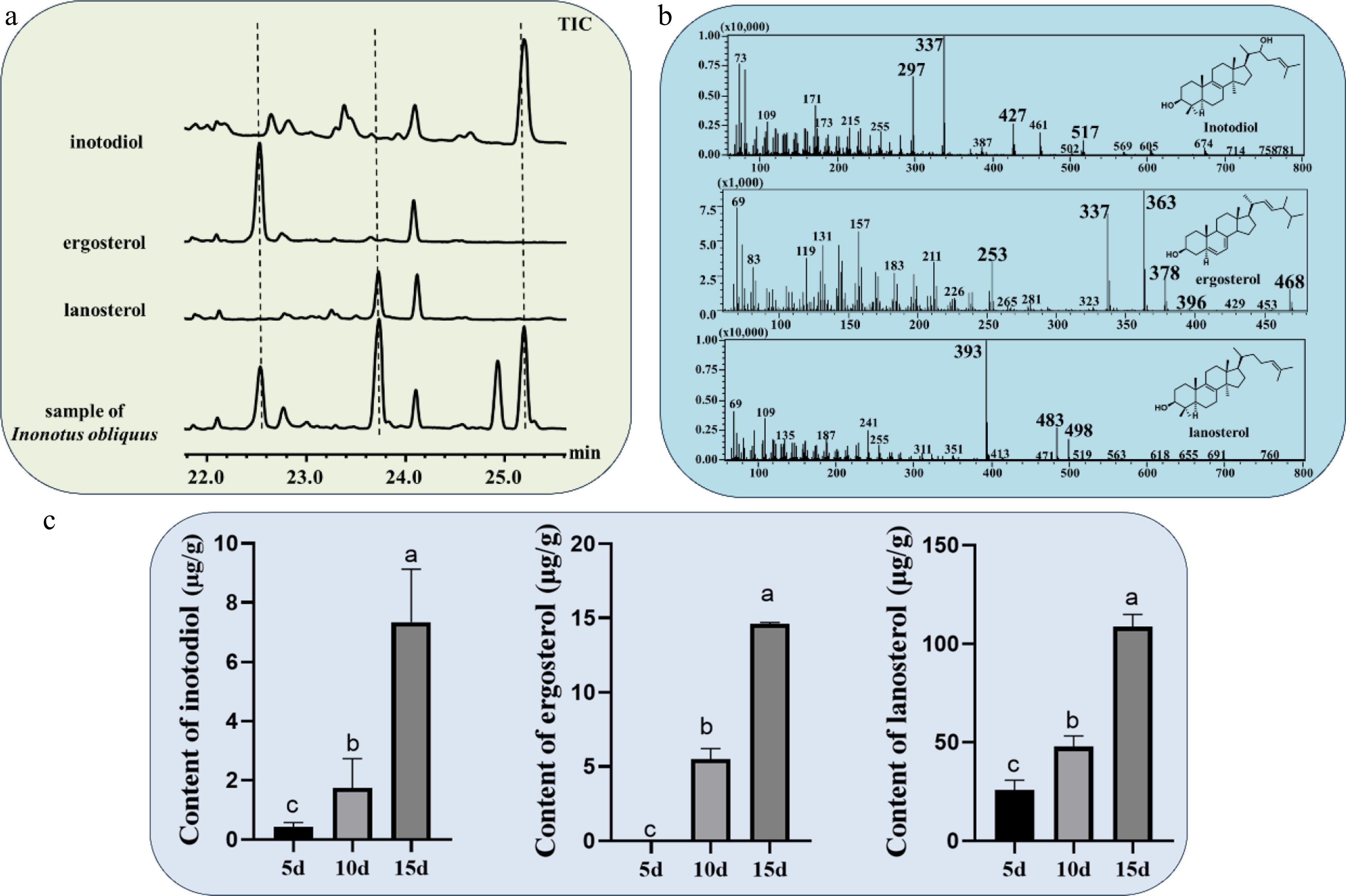 (a) GC-MS chromatograms analysis sample of I. obliquus in rice culture medium and three triterpene skeleton standards. (b) Mass spectra of inotodiol, ergosterol, and lanosterol. (c) Content of different triterpenoids in I. obliquus under different times.