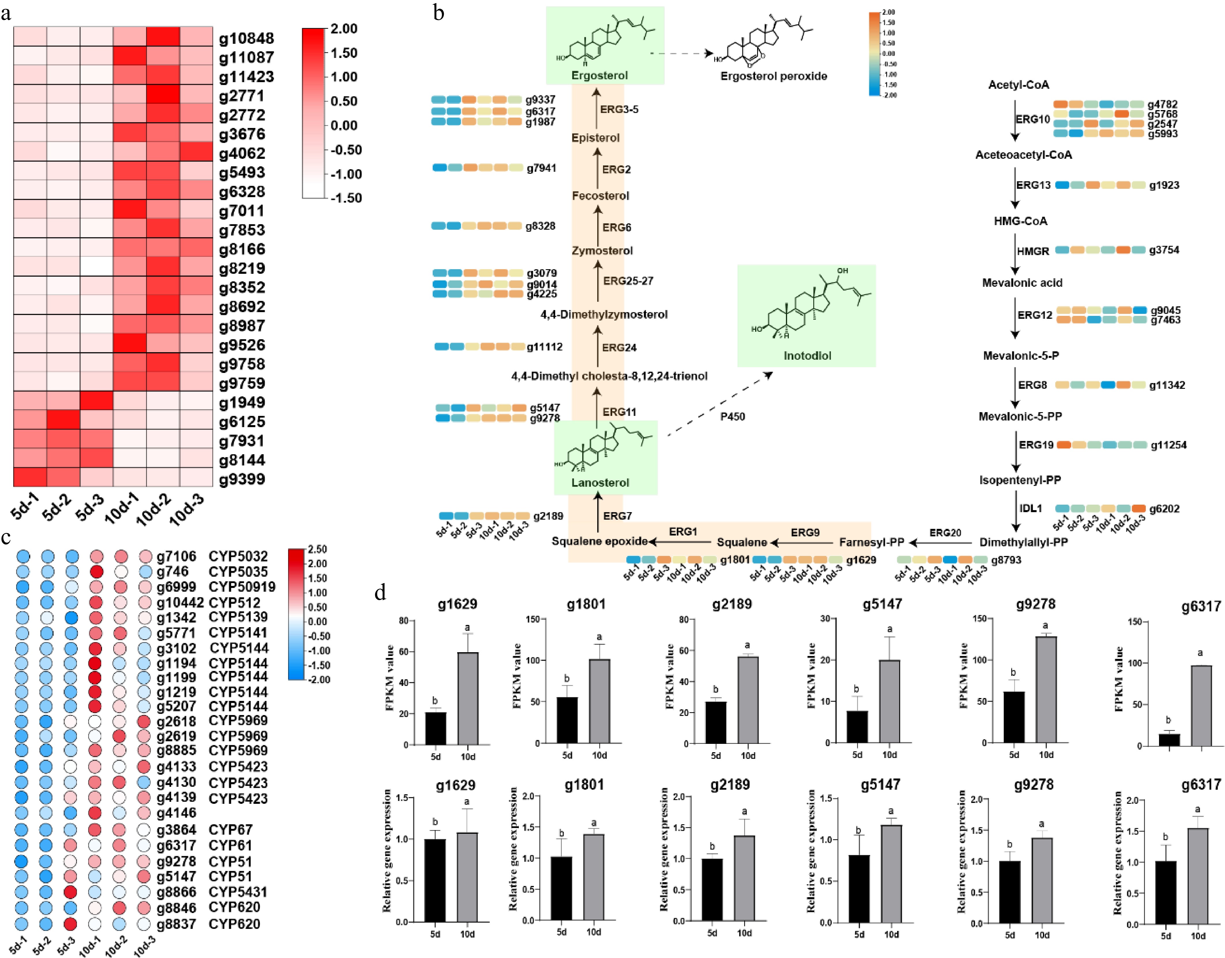 Analysis and validation of key metabolic pathways during the developmental transition (5 vs 10 d). (a) Expression profiles of differentially expressed genes (DEGs) related to carbohydrate transport and metabolism. (b) DEGs involved in the mevalonate (MVA) pathway and downstream ergosterol biosynthesis. (c) Heatmap of cytochrome P450 (CYP450)-related DEGs, showing a predominant upregulation pattern. (d) Quantitative PCR (qPCR) validation of selected genes from the triterpenoid and ergosterol biosynthesis pathways at 5 and 10 d. Data are presented as mean ± SD (n = 3). The classification of the CYP family was directly distinguished based on the CYP database website (https://p450atlas.org/index.html).
