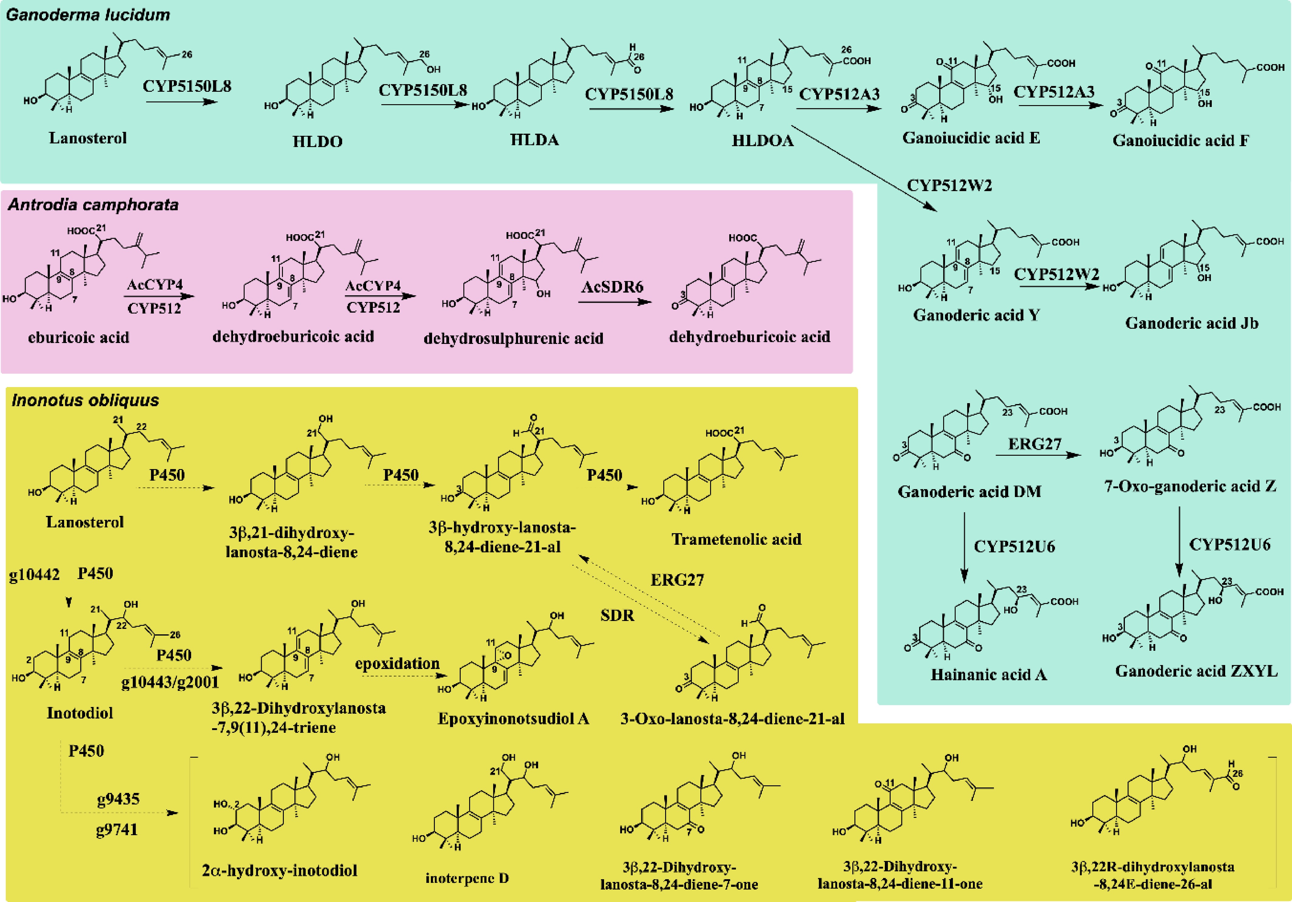 Based on the functional analysis of P450, SDR, and ERG27 in G. lucidum and A. camphorata, the biosynthetic pathway of reported triterpenoids in I. obliquus was speculated. Solid lines indicate experimentally confirmed reaction conversions; dashed lines to represent predicted reactions in the study.