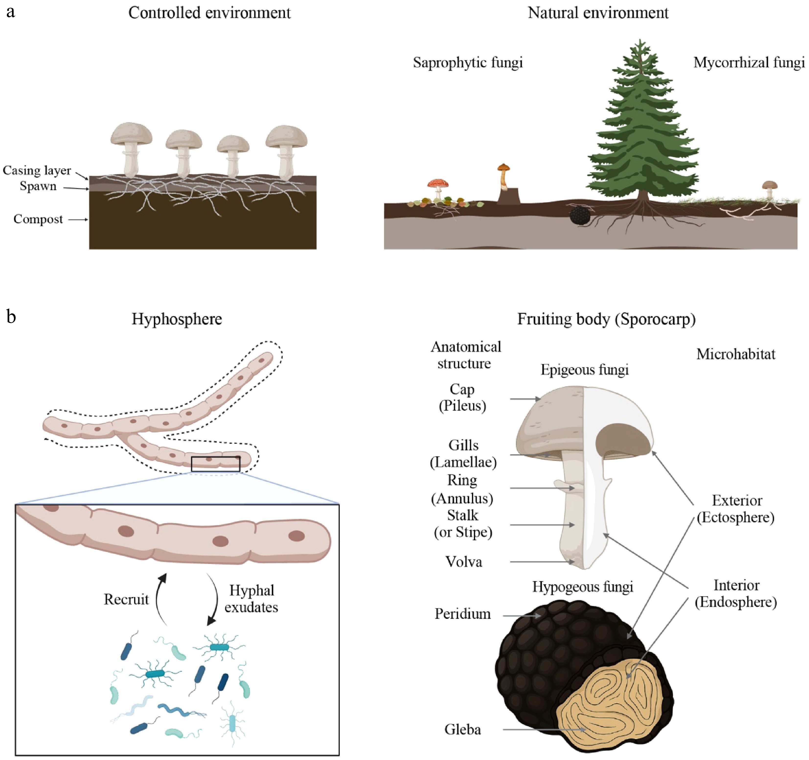 Macro- and micro-habitat structures of mushroom-forming fungi. (a) Macrohabitats in which mushroom-forming fungi reside. Cultivated mushroom fungi, such as Agaricus bisporus, are generally grown under the standardized conditions consisting of compost soils, spawn, and casing layers (left panel). In contrast, most wild mushroom-forming fungi naturally inhabit forest environments, where saprotrophic species are found in the litter and humus layers, and mycorrhizal species associate with the root zones of host plants (right panel). (b) Microhabitats where mushroom fungi-associated microbiomes are generally found. The hyphosphere is the soil region affected by fungal hyphae (left panel; space indicated with the dashed line). Mushroom fungi secrete hyphal exudates acting as nutrient sources or signal molecules to attract microbes that can provide nutrients or protect fungi from other harmful microbes, similar to the plant microbiomes in the rhizosphere soils. Another microhabitat is the fruiting body (sporocarp). The distinguished anatomical structure of the fruiting bodies is depicted in the right panel. Mushroom-associated microbiomes could be found on the outer layer of the fruiting bodies (ectosphere) as epiphytes or inside them (endosphere) as endophytes. The figure was created in BioRender (https://biorender.com).