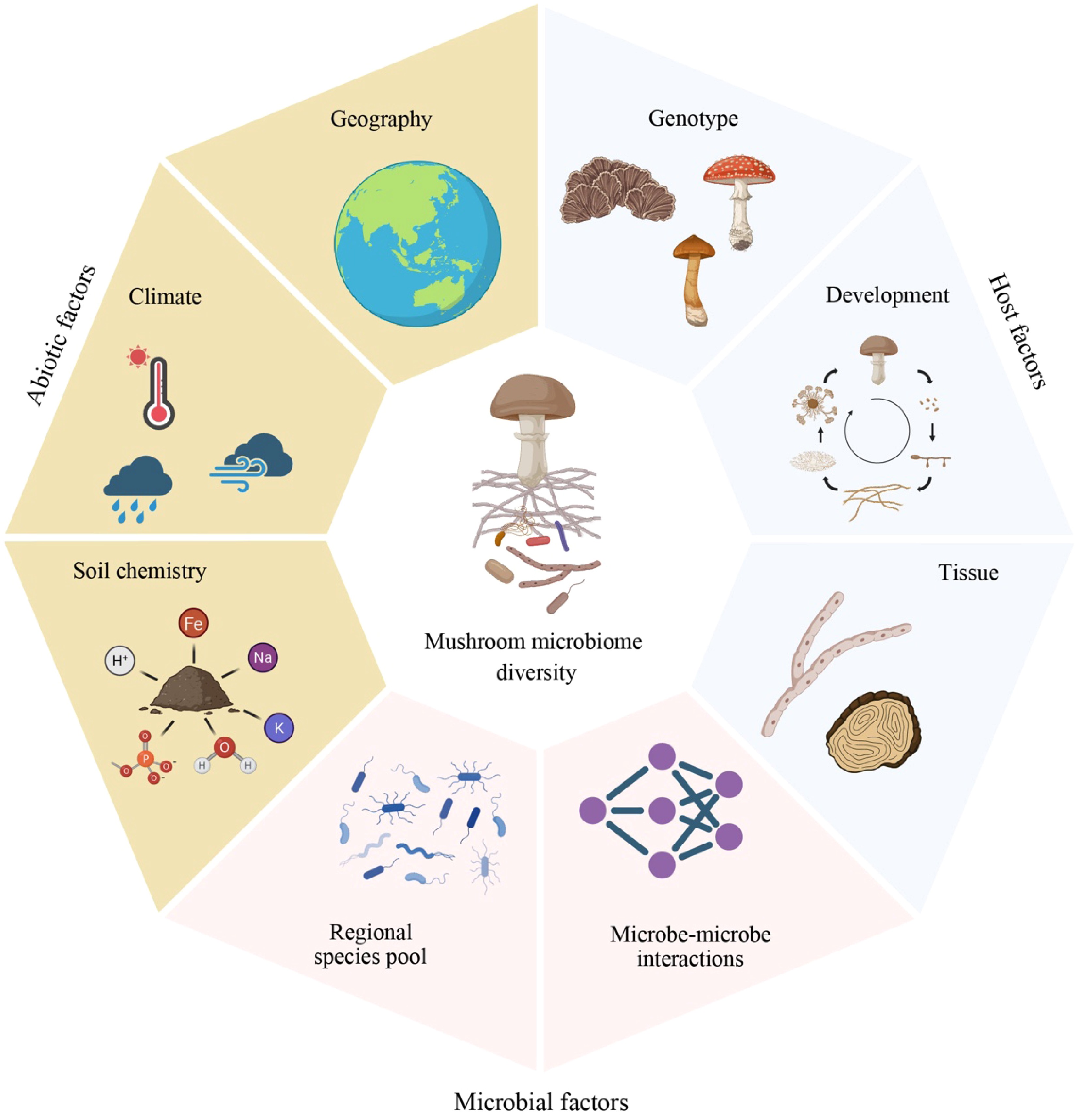 Abiotic and biotic factors influencing mushroom microbiome diversity. Microbiomes associated with mushroom-forming fungi are shaped by abiotic (brown-filled cells), host-related (blue-filled cells), and microbe-associated factors (red-filled cells). Although each factor is depicted separately, these factors are tightly linked to each other. The figure was created in BioRender.