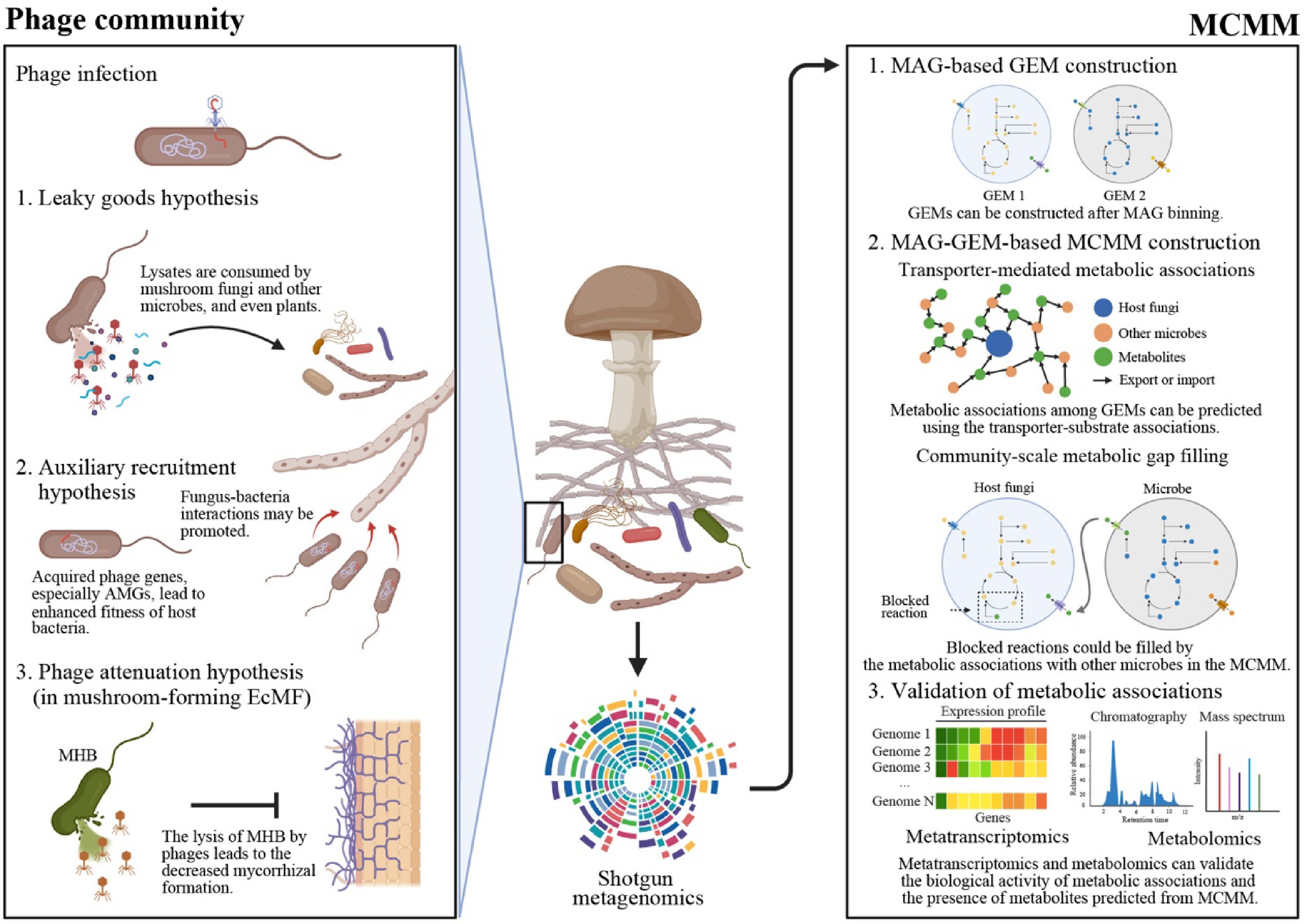 The proposed holistic framework for a comprehensive understanding of mushroom-microbiome associations. To expand our knowledge of mushroom microbiomes, we proposed two agendas: phage communities (left panel) and microbial community-scale metabolic model (MCMM) (right panel). The phage communities are expected to contribute to the ecological functions of mushroom microbiomes by directly regulating bacterial populations and introducing auxiliary metabolic genes (AMGs) to bacterial populations. Phage-induced bacterial cell lysis can improve soil nutrient conditions by viral shunt (Leaky goods hypothesis). Furthermore, during lysogenic interactions, phage's AMGs can be introduced to bacterial hosts, leading to increased bacterial fitness and promoted associations between mushroom-forming fungi and bacteria (Auxiliary recruitment hypothesis). In case of mushroom-forming mycorrhizal fungi, bacterial lysis can lead to decreased mycorrhizal formation or diminished mycorrhizal activity (phage attenuation hypothesis). These putative phages' roles imply the necessity for researching phage communities in mushroom microbiomes, although thorough experimental approaches should be performed to prove or disprove the suggested hypotheses. Please note that the figure describing the phage-associated hypotheses (left panel) is modified from the artwork in by Berrios[115]. Please see this latest insightful forum article for more information on mycorrhizal fungi-bacteria-phage interactions. Another experimental approach is MCMM, a powerful tool for examining metabolic associations among microbes at the community level (right panel). From metagenome data, genome-scale metabolic models (GEMs) of each metagenome-assembled genome (MAG) can be reconstructed. Using these GEMs, potential cross-feeding interactions and transporter-mediated metabolic exchanges can be inferred, enabling the identification of putative key metabolites required for mushroom-forming fungi. Furthermore, community-scale metabolic gap-filling of GEMs, including host fungi, enables a mechanistic understanding of the observed microbial associations by revealing essential metabolic interdependencies and complementary pathways in the examined mushroom microbiomes. Finally, metatranscriptomics and metabolomics can help researchers assess whether the predicted metabolic interactions are biologically active and whether the predicted key metabolites are present in the samples. For more information of MCMM, please see a cutting-edge review article addressed by Quinn-Bohmann et al.[119]. The figure was created in BioRender.